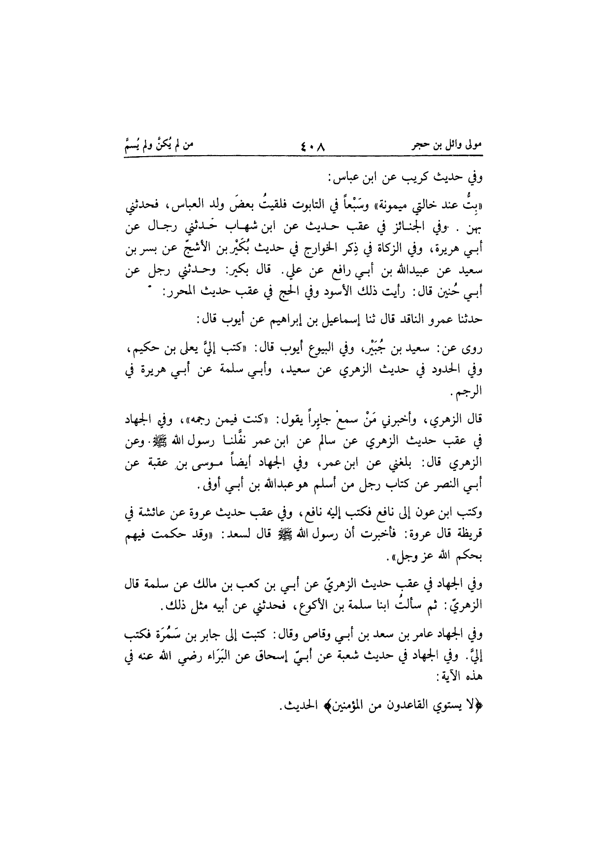 وَفِي الْجِهَاد عَامر بن سعد بن أبي وَقاص وَقَالَ كتبت إِلَى جَابر بن سَمُرَة فَكتب إِلَى وَفِي الْجِهَاد فِي حَدِيث شُعْبَة عَن أبي إِسْحَاق عَن الْبَراء رَضِي الله عَنهُ فِي هَذِه الْآيَة {لَا يَسْتَوِي الْقَاعِدُونَ من الْمُؤمنِينَ} الحَدِيث
