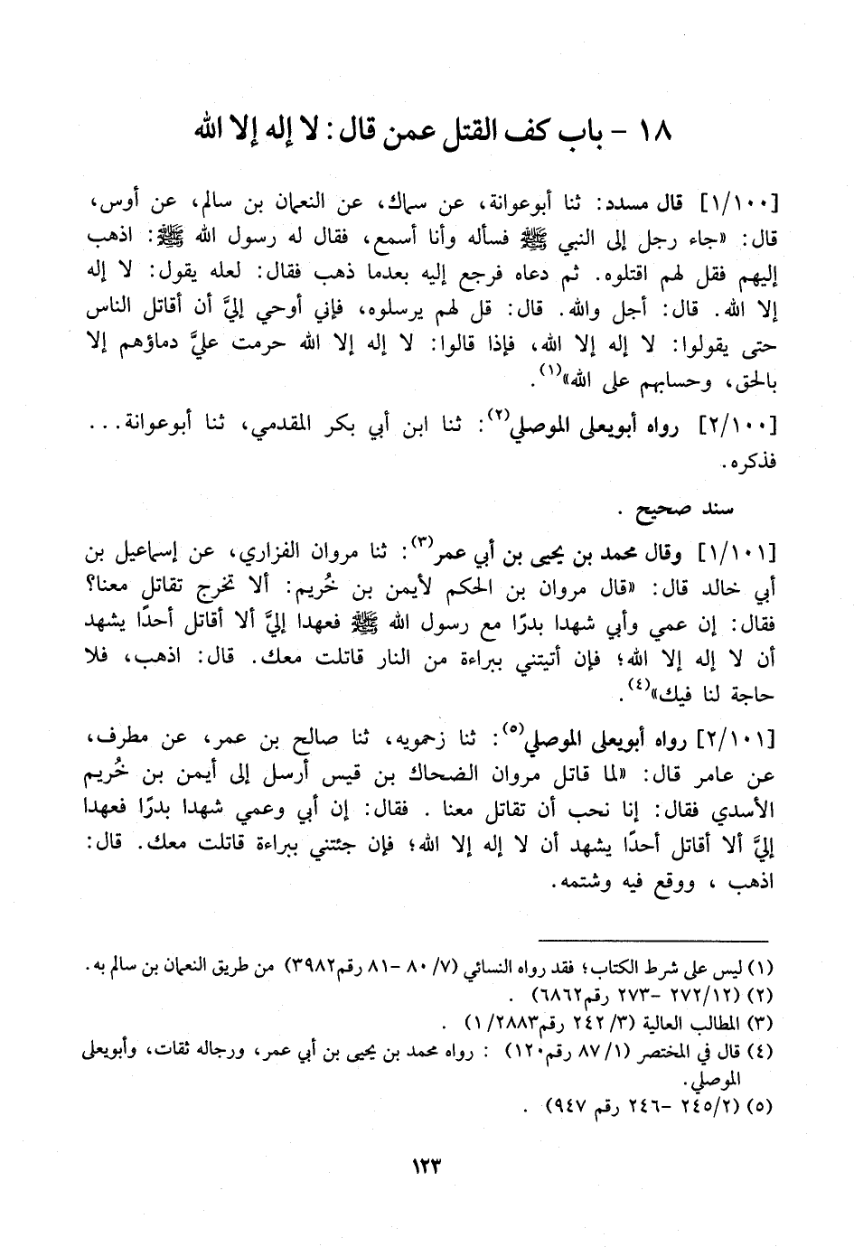 100 / 1 - قَالَ مُسَدَّدٌ: ثنا أَبُو عَوَانَةَ، عَنْ سِمَاكٍ، عَنِ النُّعْمَانِ بْنِ سَالِمٍ، عَنْ أَوْسٍ، قَالَ: "جَاءَ رَجُلٌ إِلَى النَّبِيِّ - صَلَّى اللَّهُ عَلَيْهِ وَسَلَّمَ - فَسَأَلَهُ وَأَنَا أَسْمَعُ، فَقَالَ لَهُ رَسُولُ اللَّهِ - صَلَّى اللَّهُ عَلَيْهِ وَسَلَّمَ -: اذْهَبْ إِلَيْهِمْ فَقُلْ لَهُمُ اقتلوه. ثم دعاه فرجع إليه بعدما ذَهَبَ فَقَالَ: لَعَلَّهُ يَقُولُ: لَا إِلَهَ إِلَّا اللَّهُ. قَالَ: أَجَلْ وَاللَّهِ. قَالَ: قُلْ لَهُمْ يُرْسِلُوهُ، فَإِنِّي أُوحِيَ إليَّ أَنْ أُقَاتِلَ النَّاسَ حَتَّى يَقُولُوا: لَا إِلَهَ إِلَّا اللَّهُ، فَإِذَا قَالُوا: لَا إِلَهَ إِلَّا اللَّهُ حُرِّمَتْ عليَّ دِمَاؤُهُمْ إِلَّا بِالْحَقِّ، وَحِسَابُهُمْ عَلَى اللَّهِ "