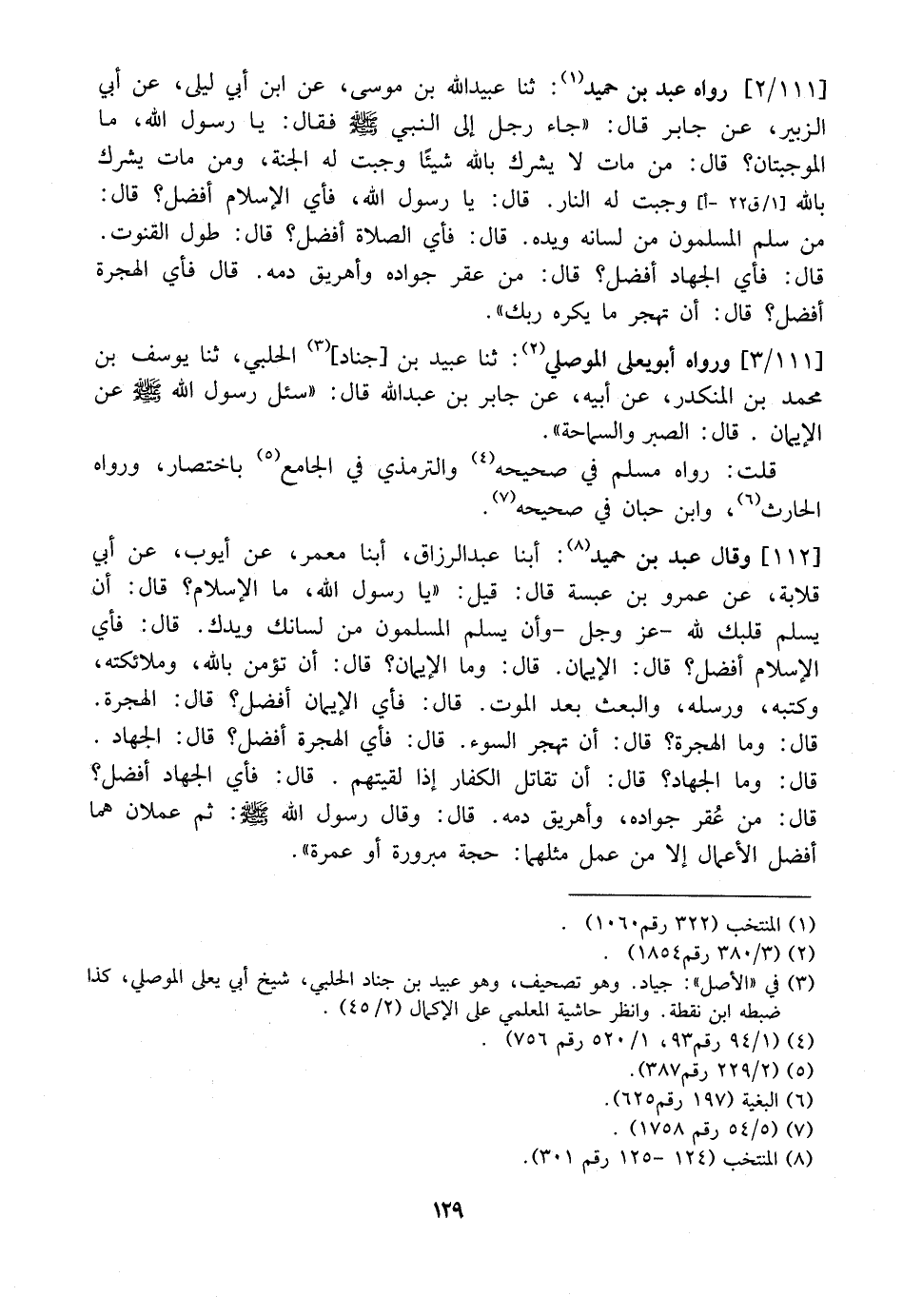 111 / 2 - رَوَاهُ عَبْدُ بْنُ حُمَيْدٍ: ثَنَا عُبَيْدُ اللَّهِ بْنُ مُوسَى، عَنِ ابْنِ أَبِي لَيْلَى، عَنْ أَبِي الزُّبَيْرِ، عَنْ جَابِرٍ قَالَ: "جَاءَ رَجُلٌ إِلَى النَّبِيِّ - صَلَّى اللَّهُ عَلَيْهِ وَسَلَّمَ - فَقَالَ: يَا رَسُولَ اللَّهِ، مَا الْمُوجِبَتَانِ؟ قَالَ: مَنْ مَاتَ لَا يُشْرِكُ بِاللَّهِ شَيْئًا وَجَبَتْ لَهُ الْجَنَّةُ، وَمَنْ مَاتَ يُشْرِكُ بِاللَّهِ وَجَبَتْ لَهُ النَّارُ. قَالَ: يَا رَسُولَ اللَّهِ، فَأَيُّ الْإِسْلَامِ أَفْضَلُ؟ قَالَ: مَنْ سَلِمَ الْمُسْلِمُونَ مِنْ لِسَانِهِ وَيَدِهِ. قَالَ: فَأَيُّ الصَّلَاةِ أَفْضَلُ؟ قَالَ: طُولُ الْقُنُوتِ. قَالَ: فَأَيُّ الْجِهَادِ أَفْضَلُ؟ قَالَ: مَنْ عُقِرَ جَوَادُهُ وَأُهْرِيقَ دَمُهُ. قَالَ فَأَيُّ الْهِجْرَةِ أَفْضَلُ؟ قَالَ: أَنْ تَهْجُرَ مَا يَكْرَهُ رَبُّكَ ".