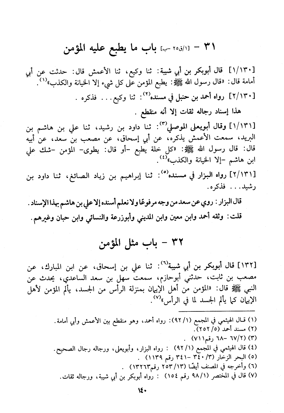 130 / 1 - قَالَ أَبُو بَكْرِ بْنُ أَبِي شَيْبَةَ: ثَنَا وكيع، ثنا الْأَعْمَشُ قَالَ: حُدِّثْتُ عَنْ أَبِي أُمَامَةَ قَالَ: "قَالَ رَسُولُ اللَّهِ - صَلَّى اللَّهُ عَلَيْهِ وسلم -: يَطْبَعُ الْمُؤْمِنُ عَلَى كُلِّ شَيْءٍ إِلَّا الْخِيَانَةَ وَالْكَذِبَ ".