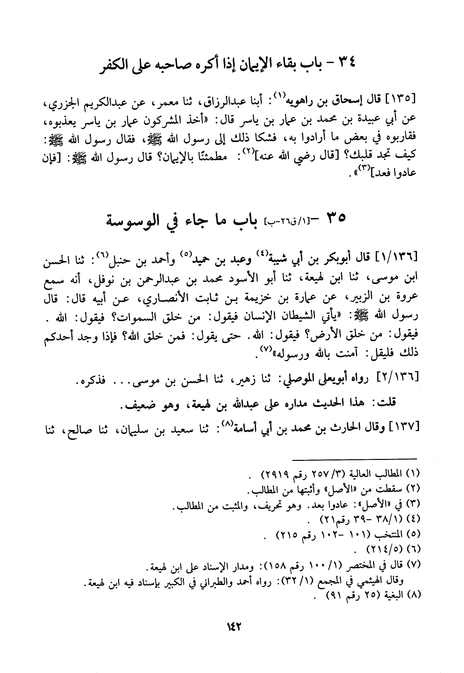 136 / 1 - قَالَ أَبُو بَكْرِ بْنُ أَبِي شَيْبَةَ وَعَبْدُ بْنُ حُمَيْدٍ وَأَحْمَدُ بْنُ حَنْبَلٍ: ثنا الحسن ابن مُوسَى، ثنا ابْنُ لَهِيعَةَ، ثنا أَبُو الْأَسْوَدِ مُحَمَّدُ بْنُ عَبْدِ الرَّحْمَنِ بْنِ نَوْفَلٍ، أَنَّهُ سَمِعَ عُرْوَةَ بْنَ الزُّبَيْرِ، عَنْ عُمَارَةَ بْنِ خُزَيْمَةَ بْنِ ثَابِتٍ الْأَنْصَارِيِّ، عَنْ أَبِيهِ قَالَ: قَالَ رَسُولُ اللَّهِ - صَلَّى الله عليه وسلم -: "يَأْتِي الشَّيْطَانُ الْإِنْسَانَ فَيَقُولُ: مَنْ خَلَقَ السَّمَوَاتِ؟ فَيَقُولُ: اللَّهُ. فَيَقُولُ: مَنْ خَلَقَ الْأَرْضَ؟ فَيَقُولُ: اللَّهُ. حَتَّى يَقُولَ: فَمَنْ خَلَقَ اللَّهَ؟ فَإِذَا وَجَدَ أَحَدُكُمْ ذَلِكَ فَلْيَقُلْ: آمَنْتُ بِاللَّهِ وَرَسُولِهِ ".