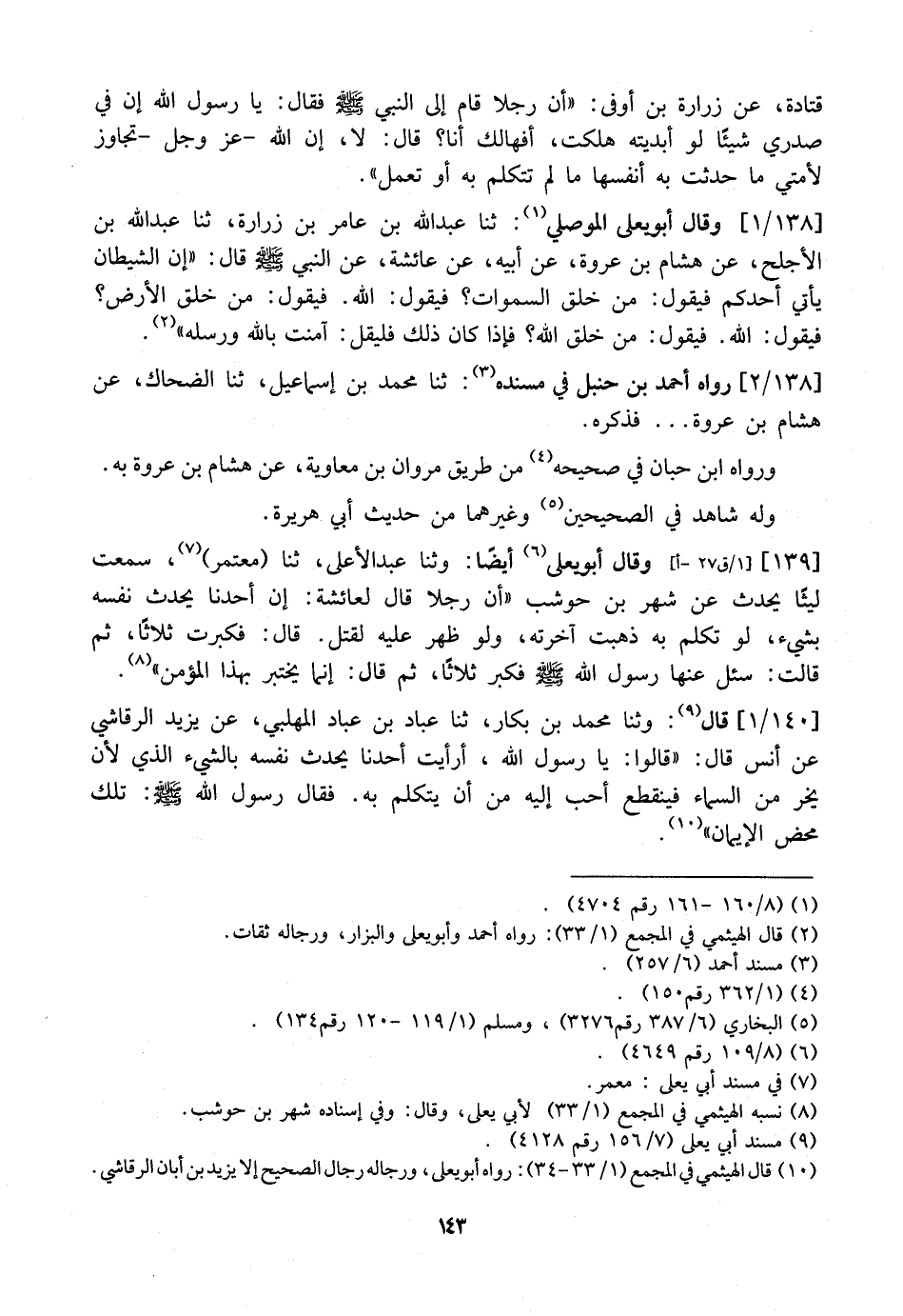 138 / 1 - وَقَالَ أَبُو يَعْلَى الْمَوْصِلِيُّ: ثَنَا عَبْدُ اللَّهِ بْنُ عَامِرِ بْنِ زُرَارَةَ، ثنا عَبْدُ اللَّهِ بْنُ الْأَجْلَحِ، عَنْ هِشَامِ بْنِ عُرْوَةَ، عَنْ أَبِيهِ، عَنْ عَائِشَةَ، عَنِ النَّبِيِّ - صَلَّى اللَّهُ عَلَيْهِ وَسَلَّمَ - قَالَ: "إِنَّ الشَّيْطَانَ يَأْتِي أَحَدَكُمْ فَيَقُولُ: مَنْ خَلَقَ السَّمَوَاتِ؟ فَيَقُولُ: اللَّهُ. فَيَقُولُ: مَنْ خَلَقَ الْأَرْضَ؟ فَيَقُولُ: اللَّهُ. فَيَقُولُ: مَنْ خَلَقَ اللَّهَ؟ فَإِذَا كَانَ ذَلِكَ فَلْيَقُلْ: آمَنْتُ بِاللَّهِ وَرُسُلِهِ ".