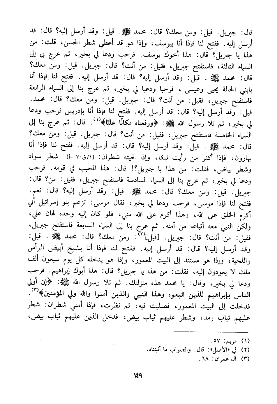 مَكَانًا عليًّا} . قَالَ: ثُمَّ عُرِجَ بِنَا إِلَى السَّمَاءِ الْخَامِسَةِ فَاسْتَفْتَحَ جِبْرِيلُ، فَقِيلَ: مَنْ أَنْتَ؟ قَالَ: جِبْرِيلُ. قِيلَ: وَمَنْ مَعَكَ؟ قَالَ: مُحَمَّدٌ - صَلَّى اللَّهُ عَلَيْهِ وَسَلَّمَ -. قِيلَ: وَقَدْ أُرْسِلَ إِلَيْهِ؟ قَالَ: قَدْ أُرْسِلَ إِلَيْهِ. فَفُتِحَ لَنَا فَإِذَا أَنَا بهارون، فإذا أكثر من رأيت تبعًا، وإذا لِحْيَتُهُ شَطْرَانِ شَطْرٌ سَوَادٌ وَشَطْرٌ بَيَاضٌ، فَقُلْتُ: مَنْ هَذَا يَا جِبْرِيلُ؟! قَالَ: هَذَا الْمُحَبَّبُ فِي قَوْمِهِ. فَرَحَّبَ وَدَعَا لِي بِخَيْرٍ، ثُمَّ عُرِجَ بِنَا إِلَى السَّمَاءِ السَّادِسَةِ فَاسْتَفْتَحَ جِبْرِيلُ، فَقِيلَ: مَنْ؟ قَالَ: جِبْرِيلُ. قِيلَ: وَمَنْ مَعَكَ؟ قَالَ: مُحَمَّدٌ - صَلَّى اللَّهُ عَلَيْهِ وَسَلَّمَ -. قِيلَ: وَقَدْ أُرْسِلَ إِلَيْهِ؟ قَالَ: نَعَمْ. فَفُتِحَ لَنَا فَإِذَا مُوسَى، فَرَحَّبَ وَدَعَا لِي بِخَيْرٍ، فَقَالَ مُوسَى: تَزْعُمُ بَنُو إِسْرَائِيلَ أَنِّي أَكْرَمُ الْخَلْقِ عَلَى اللَّهِ، وَهَذَا أَكْرَمُ عَلَى اللَّهِ مِنِّي، فَلَوْ كَانَ إِلَيْهِ وَحْدَهُ لَهَانَ عَلَيَّ، وَلَكِنَّ النبي - صلى الله عليه وسلم - مَعَهُ أَتْبَاعُهُ مِنْ أُمَّتِهِ. ثُمَّ عُرِجَ بِنَا إِلَى السَّمَاءِ السَّابِعَةِ فَاسْتَفْتَحَ جِبْرِيلُ، فَقِيلَ: مَنْ أَنْتَ؟ قَالَ: جِبْرِيلُ. قِيلَ،: وَمَنْ مَعَكَ؟ قَالَ: مُحَمَّدٌ - صَلَّى اللَّهُ عَلَيْهِ وَسَلَّمَ -. قِيلَ: وَقَدْ أُرْسِلَ إِلَيْهِ؟ قَالَ: قَدْ أُرْسِلَ إِلَيْهِ. فَفُتِحَ لَنَا فَإِذَا أَنَا بِشَيْخٍ أَبْيَضِ الرَّأْسِ وَاللِّحْيَةِ، وَإِذَا هُوَ مُسْتَنِدٌ إِلَى الْبَيْتِ الْمَعْمُورِ، وَإِذَا هُوَ يَدْخُلُهُ كُلَّ يَوْمٍ سَبْعُونَ أَلْفَ مَلَكٍ لَا يَعُودُونَ إِلَيْهِ، فَقُلْتُ: مَنْ هَذَا يَا جِبْرِيلُ؟ قَالَ: هَذَا أَبُوكَ إِبْرَاهِيمُ. فَرَحَّبَ وَدَعَا لِي بِخَيْرٍ، وَقَالَ: يَا مُحَمَّدُ هَذِهِ مَنْزِلَتُكَ. ثُمَّ تَلَا رَسُولُ اللَّهِ - صَلَّى اللَّهُ عَلَيْهِ وَسَلَّمَ - {إِنَّ أَوْلَى النَّاسِ بِإِبْرَاهِيمَ لَلَّذِينَ اتَّبَعُوهُ وَهَذَا النَّبِيُّ وَالَّذِينَ آمَنُوا وَاللَّهُ وَلِيُّ الْمُؤْمِنِينَ} . فَدَخَلْتُ إِلَى الْبَيْتِ الْمَعْمُورِ، فَصَلَّيْتُ فِيهِ، ثُمَّ نَظَرْتُ، فَإِذَا أُمَّتِي شَطْرَانِ: شَطْرٌ عَلَيْهِمْ ثِيَابٌ رَمَدٌ، وَشَطْرٌ عَلَيْهِمْ ثِيَابٌ بِيضٌ، فَدَخَلَ الَّذِينَ عَلَيْهِمْ ثِيَابٌ بِيضٌ،