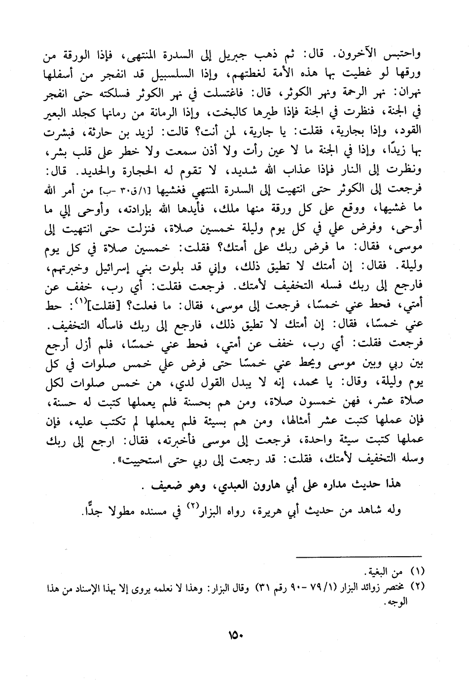 وَاحْتُبِسَ الْآخَرُونَ. قَالَ: ثُمَّ ذَهَبَ جِبْرِيلُ إِلَى السدرة الْمُنْتَهَى، فَإِذَا الْوَرَقَةُ مِنْ وَرَقِهَا لَوْ غُطِّيَتْ بِهَا هَذِهِ الْأُمَّةُ لَغَطَّتْهُمْ، وَإِذَا السَّلْسَبِيلُ قَدِ انْفَجَرَ مِنْ أَسْفَلِهَا نَهْرَانِ: نَهْرُ الرَّحْمَةِ وَنَهْرُ الْكَوْثَرِ، قَالَ: فَاغْتَسَلْتُ فِي نَهْرِ الْكَوْثَرِ فَسَلَكْتُهُ حَتَّى انْفَجَرَ فِي الْجَنَّةِ، فَنَظَرْتُ فِي الْجَنَّةِ فَإِذَا طَيْرُهَا كَالْبُخْتِ، وَإِذَا الرُّمَّانَةُ مِنْ رُمَّانِهَا كجلد البعير القود، وَإِذَا بِجَارِيَةٌ، فَقُلْتُ: يَا جَارِيَةُ، لِمَنْ أَنْتِ؟ قَالَتْ: لِزَيْدِ بْنِ حَارِثَةَ، فَبَشَّرْتُ بِهَا زَيْدًا، وَإِذَا فِي الْجَنَّةِ مَا لَا عَيْنٌ رَأَتْ وَلَا أُذُنٌ سَمِعَتْ وَلَا خَطَرَ عَلَى قَلْبِ بَشَرٍ، وَنَظَرْتُ إِلَى النَّارِ فَإِذَا عَذَابُ اللَّهِ شَدِيدٌ، لَا تَقُومُ لَهُ الْحِجَارَةُ وَالْحَدِيدُ. قَالَ: فرجعت إلى الكوثر حتى انتهيت إلى السدرة الْمُنْتَهَى فَغَشِيَهَا مِنْ أَمْرِ اللَّهِ مَا غَشِيَهَا، وَوَقَّعَ عَلَى كُلِّ وَرَقَةٍ مِنْهَا مَلَكٌ، فَأَيَّدَهَا الله بإرادته، وَأَوْحَى إِلَيَّ مَا أَوْحَى، وَفَرَضَ عَلَيَّ فِي كُلِّ يَوْمٍ وَلَيْلَةٍ خَمْسِينَ صَلَاةً، فَنَزَلْتُ حَتَّى انْتَهَيْتُ إِلَى مُوسَى، فَقَالَ؟ مَا فَرَضَ رَبُّكَ عَلَى أُمَّتِكَ؟ فَقُلْتُ: خَمْسِينَ صَلَاةً فِي كُلِّ يَوْمٍ وَلَيْلَةٍ. فَقَالَ: إِنَّ أُمَّتَكَ لَا تُطِيقُ ذلك، وإني قد بلوت بَنِي إِسْرَائِيلَ وَخَبَرْتُهُمْ، فَارْجِعْ إِلَى رَبِّكَ فَسَلْهُ التَّخْفِيفَ لِأُمَّتِكَ. فَرَجَعْتُ فَقُلْتُ: أَيْ رَبِّ، خَفِّفْ عن أمتي، فحط عني خَمْسًا، فرجعت إلى مُوسَى، فَقَالَ: ما فعلت؟ أفقلت،: حط عني خمسا، فَقَالَ: إِنَّ أُمَّتَكَ لَا تطيق ذلك، فارجع إلى ربك فاسأله التَّخْفِيفَ. فَرَجَعْتُ فَقُلْتُ: أَيْ رَبِّ، خَفِّفْ عَنْ أُمَّتِي، فَحَطَّ عَنِّي خَمْسًا، فَلَمْ أَزَلْ أَرْجِعُ بَيْنَ رَبِّي وَبَيْنَ مُوسَى وَيَحُطُّ عَنِّي خَمْسًا حَتَّى فَرَضَ عَلَيَّ خَمْسَ صَلَوَاتٍ فِي كُلِّ يَوْمٍ وَلَيْلَةٍ، وَقَالَ: يَا مُحَمَّدُ، إِنَّهُ لَا يُبَدَّلُ الْقَوْلُ لَدَيَّ، هُنَّ خَمْسُ صَلَوَاتٍ لِكُلِّ صَلَاةٍ عَشْرٌ، فَهُنَّ خَمْسُونَ صَلَاةً، وَمَنْ هَمَّ بِحَسَنَةٍ فَلَمْ يَعْمَلْهَا كُتِبَتْ لَهُ حَسَنَةً، فَإِنْ عَمِلَهَا كُتِبَتْ عَشْرَ أَمْثَالِهَا، وَمَنْ هَمَّ بِسَيِّئَةٍ فلم يعملها لم تكتب عَلَيْهِ، فَإِنْ عَمِلَهَا كُتِبَتْ سَيِّئَةً وَاحِدَةً، فَرَجَعْتُ إِلَى مُوسَى فَأَخْبَرْتُهُ، فَقَالَ: ارْجِعْ إِلَى رَبِّكَ وَسَلْهُ التَّخْفِيفَ لِأُمَّتِكَ، فَقُلْتُ: قَدْ رَجَعْتُ إِلَى رَبِّي حَتَّى اسْتَحْيَيْتُ ". هَذَا حَدِيثٌ مَدَارُهُ عَلَى أَبِي هَارُونَ الْعَبْدِيِّ، وَهُوَ ضَعِيفٌ. وَلَهُ شَاهِدٌ مِنْ حَدِيثِ أَبِي هُرَيْرَةَ، رَوَاهُ الْبَزَّارُ فِي مُسْنَدِهِ مُطَوَّلًا جِدًّا.