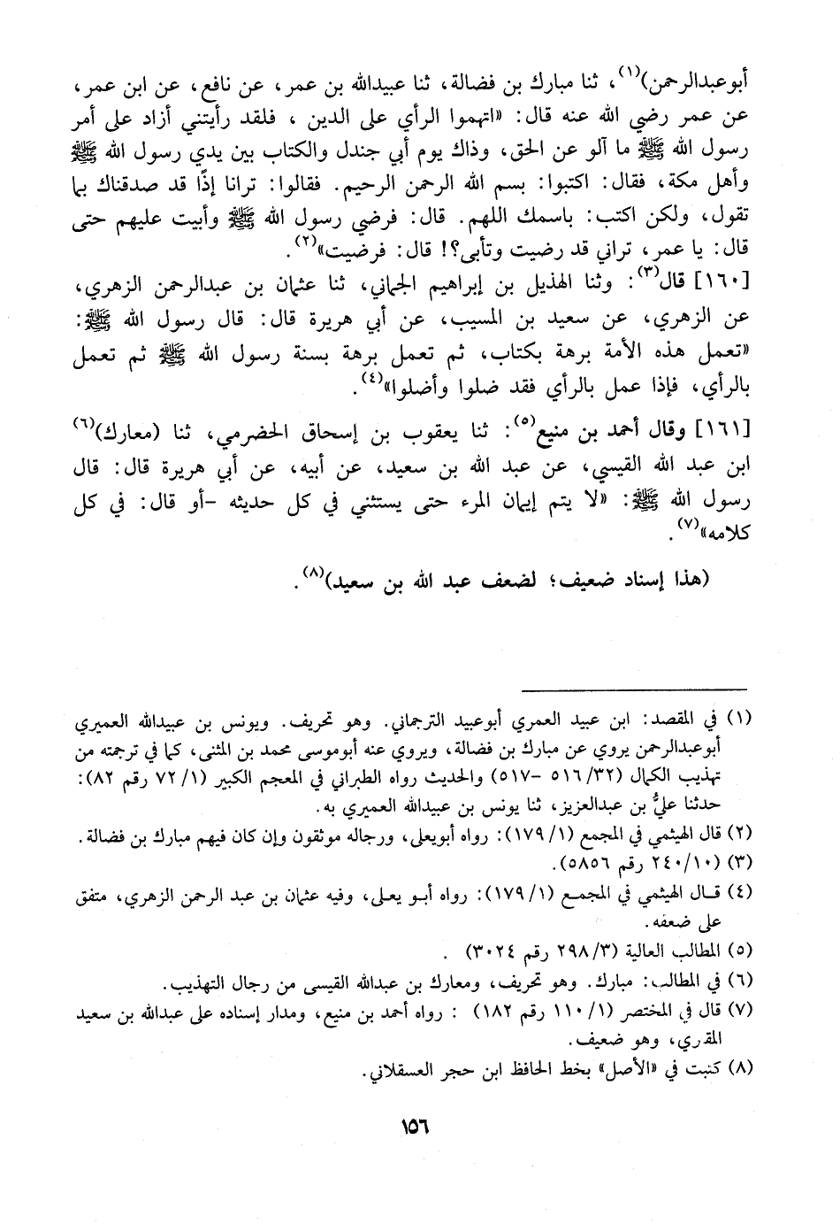 أبو عَبْدِ الرَّحْمَنِ) ، ثنا مُبَارَكُ بْنُ فَضَالَةَ، ثَنَا عُبَيْدُ اللَّهِ بْنُ عُمَرَ، عَنْ نَافِعٍ، عَنِ ابْنِ عُمَرَ، عَنْ عُمَرَ رَضِيَ اللَّهُ عَنْهُ قَالَ: "اتَّهِمُوا الرَّأْيَ عَلَى الدَّينِ، فَلَقَدْ رأيتني أزاد عَلَى أَمْرِ رَسُولِ اللَّهِ - صَلَّى اللَّهُ عَلَيْهِ وَسَلَّمَ - مَا آلُو عَنِ الْحَقِّ، وَذَاكَ يَوْمَ أَبِي جَنْدَلٍ وَالْكِتَابُ بَيْنَ يَدَيْ رَسُولِ اللَّهِ - صَلَّى اللَّهُ عَلَيْهِ وَسَلَّمَ - وَأَهْلُ مَكَّةَ، فَقَالَ: اكْتُبُوا: بِسْمِ اللَّهِ الرَّحْمَنِ الرَّحِيمِ. فَقَالُوا: تَرَانَا إذًا قد صدقناك بما تقول، ولكن اكْتُبْ: بِاسْمِكَ اللَّهُمَّ. قَالَ: فَرَضِيَ رَسُولُ اللَّهِ - صَلَّى اللَّهُ عَلَيْهِ وَسَلَّمَ - وَأَبَيْتُ عَلَيْهِمْ حَتَّى قَالَ: يَا عُمَرُ، تَرَانِي قَدْ رَضِيتُ وَتَأْبَى؟! قَالَ: فَرَضِيتُ ".