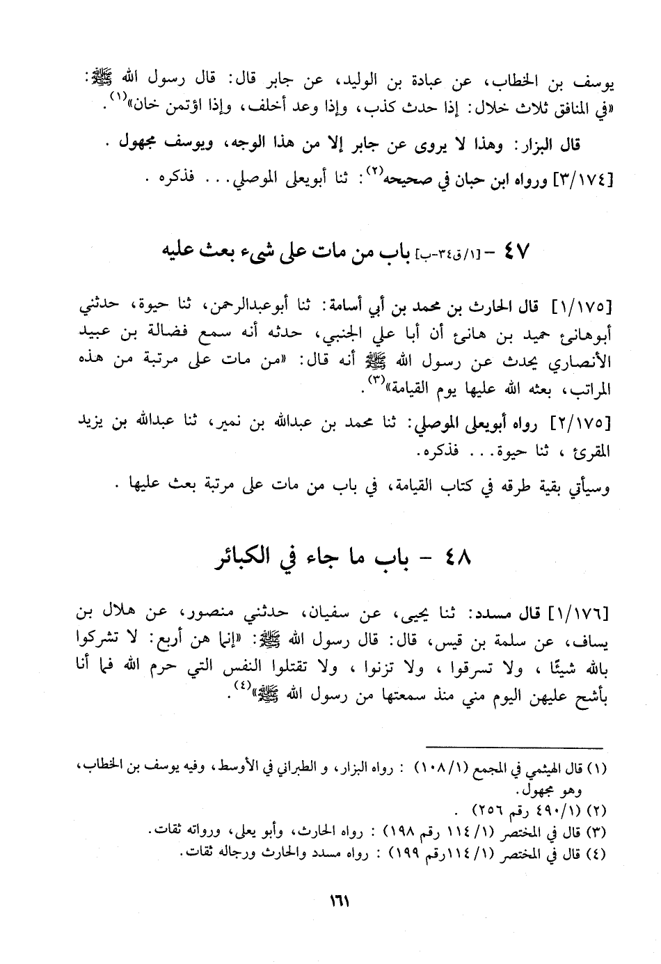 175 / 1 - قَالَ الْحَارِثُ بْنُ مُحَمَّدِ بْنِ أَبِي أُسَامَةَ: ثنا أَبُو عَبْدِ الرَّحْمَنِ، ثنا حيوة، حدثني أبو هانئ حميد بن هانئ أَنَّ أَبَا عَلِيٍّ الْجَنَبِيَّ، حَدَّثَهُ أَنَّهُ سَمِعَ فَضَالَةَ بْنَ عُبَيْدٍ الْأَنْصَارِيَّ يُحَدِّثُ عَنْ رَسُولِ الله أَنَّهُ قَالَ: "مَنْ مَاتَ عَلَى مَرْتَبَةٍ مِنْ هَذِهِ الْمَرَاتِبِ، بَعَثَهُ اللَّهُ عَلَيْهَا يَوْمَ الْقِيَامَةِ".