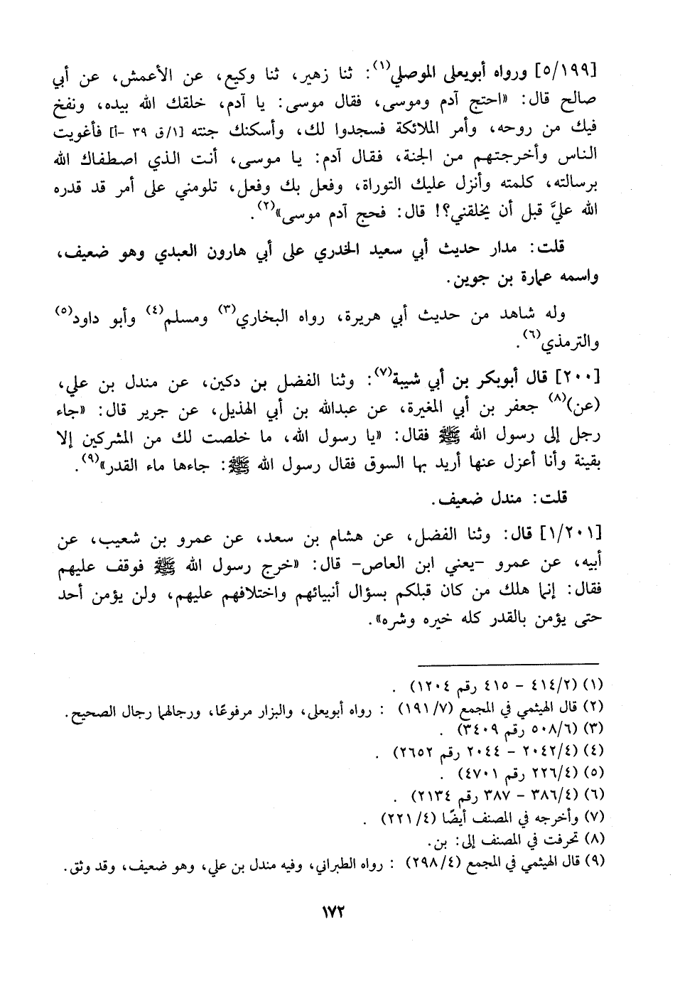 199 / 5 - وَرَوَاهُ أَبُو يَعْلَى الْمُوصِلِيُّ: ثَنَا زُهَيْرٌ، ثَنَا وَكِيعٌ، عَنِ الْأَعْمَشِ، عَنْ أَبِي صَالِحٍ قَالَ: "احتج آدم وموسى، فَقَالَ مُوسَى: يَا آدَمُ، خَلَقَكَ اللَّهُ بِيَدِهِ، وَنَفَخَ فِيكَ مِنْ رُوحِهِ وَأَمَرَ الْمَلَائِكَةَ فَسَجَدُوا لك، وأسكنك جنته فأغويت الناس وأخرجتهم من الجنة، فقالت آدَمُ: يَا مُوسَى، أَنْتَ الَّذِي اصْطَفَاكَ اللَّهُ برسالته، كلمته وأنزل عليك التوراة، وفعل بك وفعل، تلومني على أمر قد قدره الله عليَّ قبل أن يخلقني؟! قال: فحج آدم موسى".