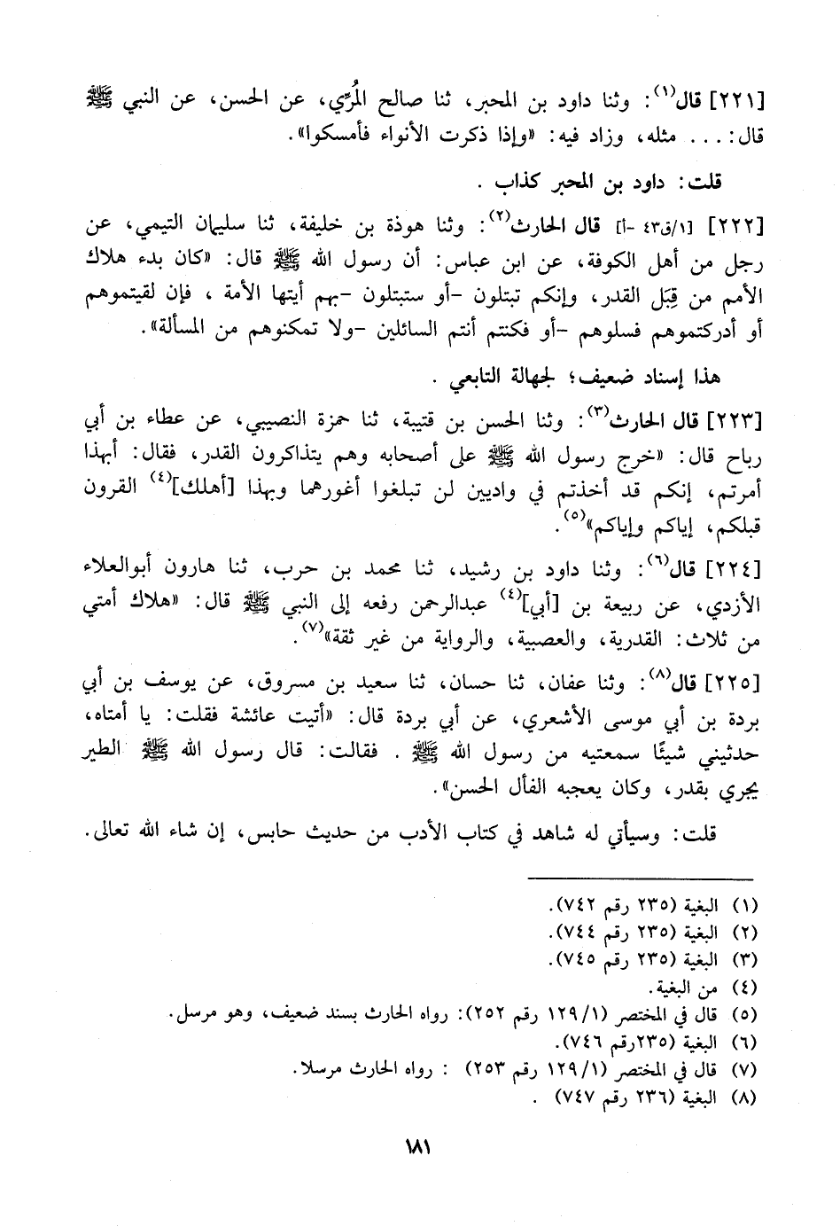 222 - قَالَ الْحَارِثُ: وثنا هَوْذَةُ بْنُ خَلِيفَةَ، ثنا سُلَيْمَانُ التَّيْمِيُّ، عَنْ رَجُلٍ مِنْ أَهْلِ الْكُوفَةِ، عَنِ ابْنِ عَبَّاسٍ: أَنّ رَسُولَ اللَّهِ - صَلَّى اللَّهُ عَلَيْهِ وَسَلَّمَ - قَالَ: "كَانَ بَدْءُ هَلَاكِ الْأُمَمِ مِنْ قِبَل الْقَدَرِ، وَإِنَّكُمْ تُبْتَلُونَ- أَوْ سَتُبْتَلُونَ- بِهِمْ أَيَّتُهَا الْأُمَّةُ، فَإِنْ لقيتموهم أو أدركتيوهم فسلوهم- أو فكنتم أَنْتُمُ السَّائِلِينَ- وَلَا تُمَكِّنُوهُمْ مِنَ الْمَسْأَلَةِ".