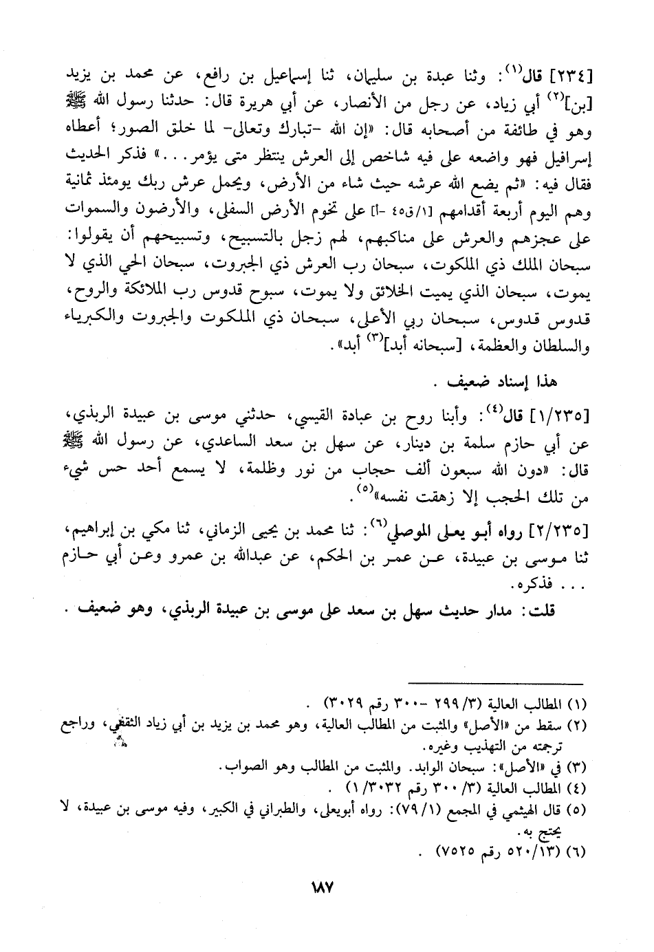 234 - قَالَ: وثنا عَبْدَةُ بْنُ سُلَيْمَانَ، ثنا إِسْمَاعِيلُ بن رافع، عن محمد بن يزيد بن أَبِي زِيَادٍ، عَنْ رَجُلٍ مِنَ الْأَنْصَارِ، عَنْ أَبِي هُرَيْرَةَ قَالَ: حَدَّثَنَا رَسُولُ اللَّهِ - صَلَّى اللَّهُ عَلَيْهِ وَسَلَّمَ - وَهُوَ فِي طَائِفَةٍ مِنْ أَصْحَابِهِ قَالَ: "إِنَّ اللَّهَ- تَبَارَكَ وَتَعَالَى- لَمَّا خَلَقَ الصُّورَ؟ أَعْطَاهُ إِسْرَافِيلَ فَهُوَ وَاضِعُهُ عَلَى فِيهِ شَاخِصٌ إِلَى الْعَرْشِ يَنْتَظِرُ مَتَى يُؤْمَرُ ... " فَذَكَرَ الْحَدِيثَ فَقَالَ فِيهِ: "ثُمَّ يَضَعُ اللَّهُ عرشه حيث شاء من الأرض، ويحمل عرش ربك يَوْمَئِذٍ ثَمَانِيَةٌ وَهُمُ الْيَوْمَ أَرْبَعَةٌ أَقْدَامُهُمْ عَلَى تُخُومِ الْأَرْضِ السُّفْلَى، وَالْأَرْضُونَ وَالسَّمَوَاتُ عَلَى عَجُزِهِمْ وَالْعَرْشُ عَلَى مَنَاكِبِهِمْ، لَهُمْ زَجَلٌ بِالتَّسْبِيحِ، وَتَسْبِيحُهُمْ أَنْ يَقُولُوا: سُبْحَانَ الْمَلِكِ ذِي الْمَلَكُوتِ، سُبْحَانَ رَبِّ الْعَرْشِ ذِي الْجَبَرُوتِ، سُبْحَانَ الْحَيِّ الَّذِي لَا يَمُوتُ، سُبْحَانَ الَّذِي يُمِيتُ الْخَلَائِقِ وَلَا يَمُوتُ، سُبُّوحٌ قُدُّوسٌ رَبُّ الْمَلَائِكَةِ وَالرُّوحِ، قُدُّوسٌ قُدُّوسٌ، سُبْحَانَ رَبِّي الْأَعْلَى، سُبْحَانَ ذِي الْمَلَكُوتِ والجبروت والكبرياء والسلطان والعظمة، أسبحانه أبد، أبد".