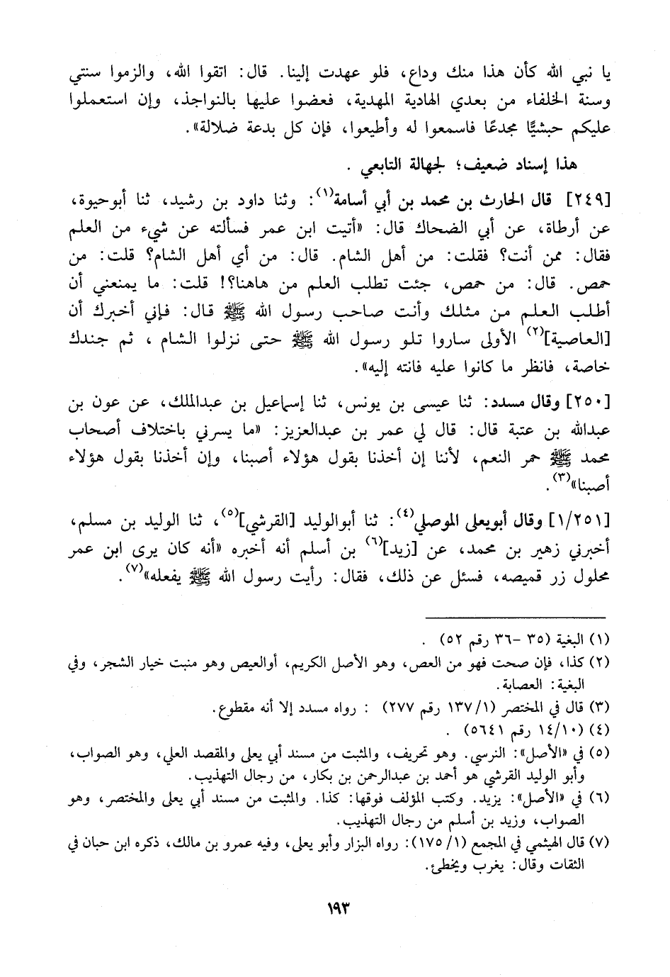 249 - قَالَ الْحَارِثُ بْنُ مُحَمَّدِ بْنِ أَبِي أُسَامَةَ: وثنا دَاوُدُ بن رشيد، فنا أَبُو حَيْوَةَ، عَنْ أَرْطَاةَ، عَنْ أَبِي الضَّحَّاكِ قَالَ: "أَتَيْتُ ابْنَ عُمَرَ فَسَأَلْتُهُ عَنْ شَيْءٍ مِنَ الْعِلْمِ فَقَالَ: مِمَّنْ أَنْتَ؟ فَقُلْتُ: مِنْ أهل الشام. قال: أن أَيِّ أَهْلِ الشَّامِ؟ قُلْتُ: مِنْ حِمْصَ. قَالَ: مِنْ حِمْصَ، جِئْتَ تَطْلُبُ الْعِلْمَ مِنْ هَاهُنَا؟! قُلْتُ: مَا يَمْنَعُنِي أَنْ أَطْلُبَ الْعِلْمَ مِنْ مِثْلِكَ وَأَنْتَ صَاحِبُ رَسُولِ اللَّهِ - صَلَّى اللَّهُ عَلَيْهِ وَسَلَّمَ - قَالَ: فَإِنِّي أُخْبِرُكَ أَنَّ الْعَاصِيَةَ الْأُولَى سَارُوا تِلْوَ رَسُولِ اللَّهِ - صَلَّى اللَّهُ عَلَيْهِ وَسَلَّمَ - حَتَّى نَزَلُوا الشَّامَ، ثُمَّ جَنَّدَكَ خَاصَّةً، فَانْظُرْ مَا كَانُوا عَلَيْهِ فَانْتَهِ إِلَيْهِ ".