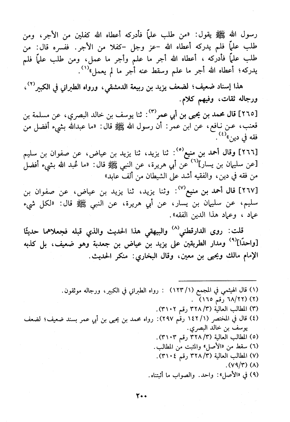 265 - قَالَ مُحَمَّدُ بْنُ يَحْيَى بْنِ أَبِي عُمَرَ: ثنا يُوسُفُ بْنُ خَالِدٍ الْبَصْرِيُّ، عَنْ مَسْلَمَةَ بْنِ قَعْنَبٍ، عَنْ نَافِعٍ، عَنِ ابْنِ عُمَرَ: أَنّ رَسُولَ اللَّهِ - صَلَّى اللَّهُ عَلَيْهِ وسلم -ِ قَالَ: "مَا عُبِدَ اللَّهُ بِشَيْءٍ أَفْضَلَ مِنْ فقه في دين ".