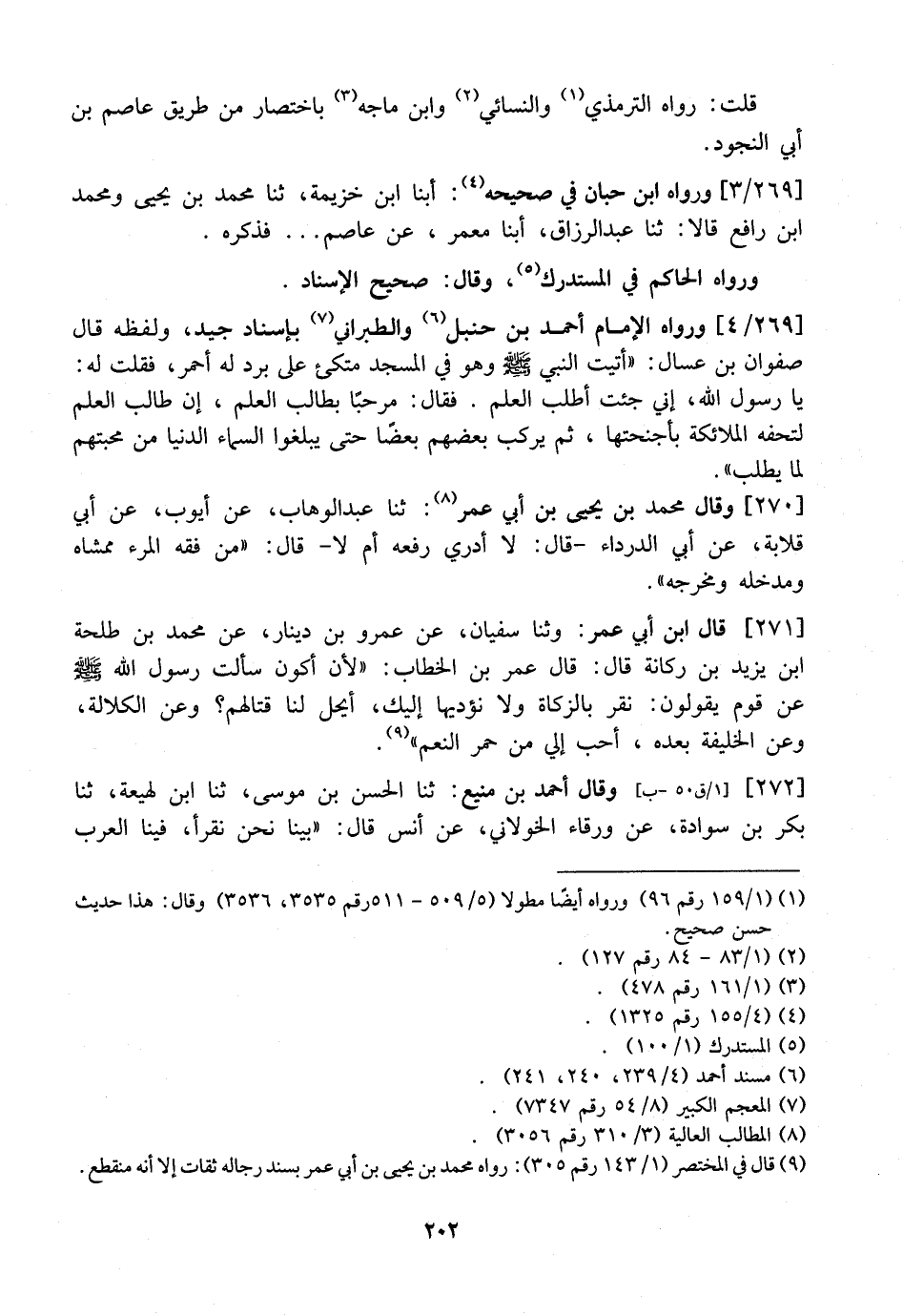269 / 4 - ورواه الإمام أحمد بن حنبل والطبراني بِإِسْنَادٍ جَيِّدٍ، وَلَفْظُهُ قَالَ صَفْوَانُ بْنُ عَسَّالٍ: "أَتَيْتُ النَّبِيَّ - صَلَّى اللَّهُ عَلَيْهِ وَسَلَّمَ - وَهُوَ فِي الْمَسْجِدِ مُتَّكِئٌ عَلَى بُرْدٍ لَهُ أَحْمَرَ، فَقُلْتُ لَهُ: يَا رَسُولَ اللَّهِ، إِنِّي جِئْتُ أَطْلُبُ الْعِلْمَ. فَقَالَ: مَرْحَبًا بِطَالِبِ الْعِلْمِ، إِنَّ طَالِبَ الْعِلْمِ لَتَحُفُّهُ الْمَلَائِكَةُ بِأَجْنِحَتِهَا، ثُمَّ يَرْكَبُ بَعْضُهُمْ بَعْضًا حَتَّى يَبْلُغُوا السَّمَاءَ الدُّنْيَا مِنْ محبتهم لمايطلب ".
