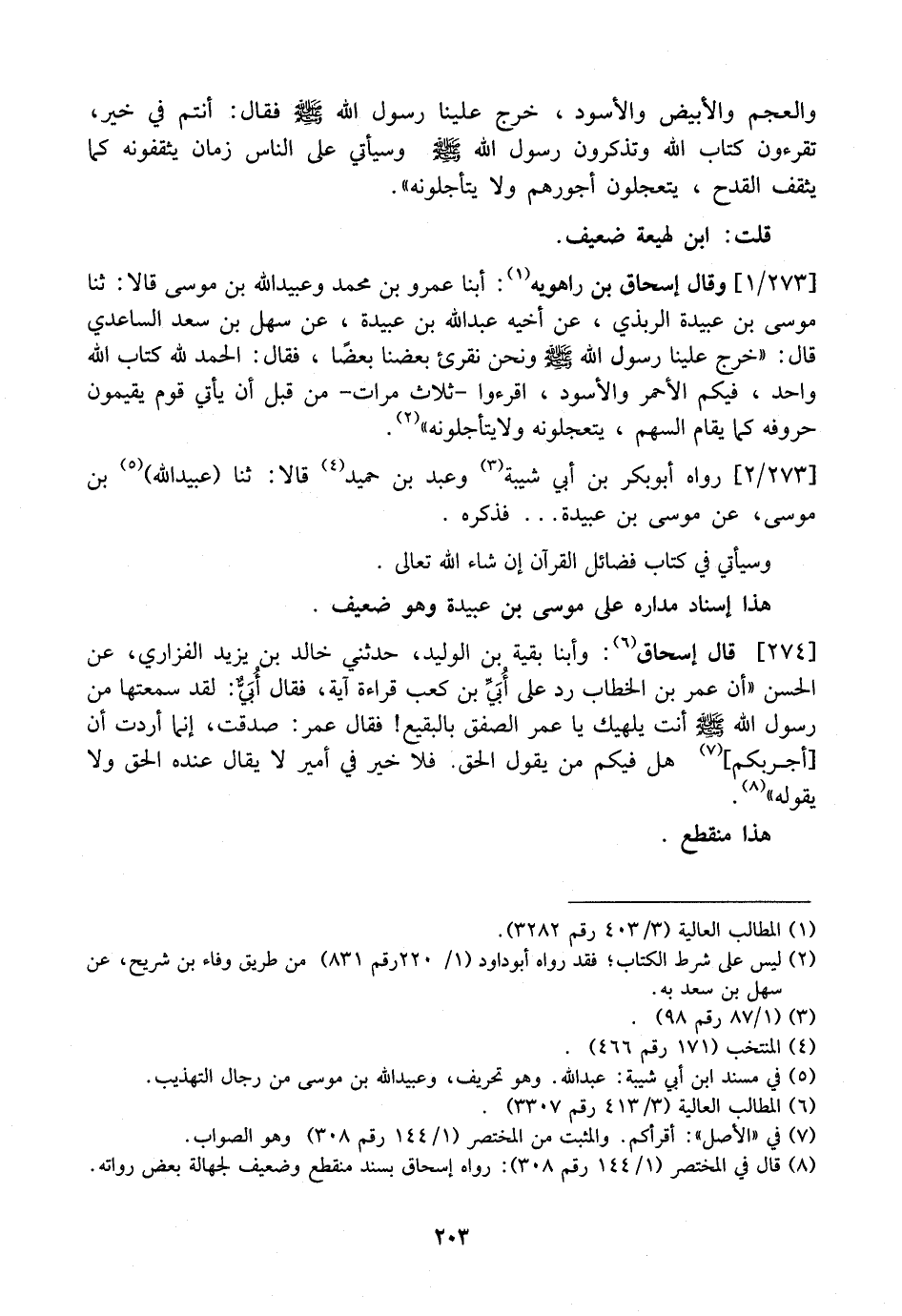 273 / 1 - وَقَالَ إِسْحَاقُ بن راهويه: أبنا عَمْرُو بْنُ مُحَمَّدٍ وَعُبَيْدِ اللَّهِ بْنُ مُوسَى قَالَا: ثنا مُوسَى بْنُ عُبَيْدَةَ الرَّبْذِيُّ، عَنْ أَخِيهِ عَبْدِ اللَّهِ بْنِ عُبَيْدَةَ، عَنْ سَهْلِ بْنِ سَعْد السَّاعِدِيِّ قَالَ: "خَرَجَ عَلَيْنَا رَسُولُ اللَّهِ - صَلَّى اللَّهُ عَلَيْهِ وَسَلَّمَ - وَنَحْنُ نَقْرِئُ بَعْضُنَا بَعْضًا، فَقَالَ: الْحَمْدُ لِلَّهِ كِتَابُ اللَّهِ وَاحِدٌ، فِيكُمُ الْأَحْمَرُ وَالْأَسْوَدُ، اقْرَءُوا- ثَلَاثَ مَرَّاتٍ- مِنْ قَبْلِ أَنْ يَأْتِيَ قَوْمٌ يُقِيمُونَ حُرُوفَهُ كما يقام السهم، يتعجلونه ولايتأجلونه ".