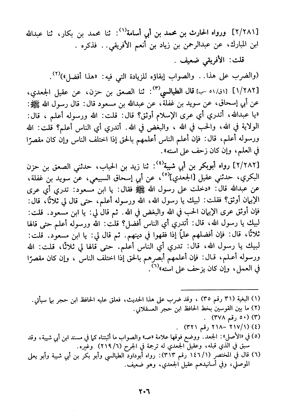 282 / 2 - رَوَاهُ أَبُو بَكْرِ بْنُ أَبِي شَيْبَةَ: ثنا زَيْدُ بْنُ الْحُبَابِ، حَدَّثَنِي الصَّعْقُ بن حزن البكري، حدثني عقيل الجعدي، عَنْ أَبِي إِسْحَاقَ السُّبَيْعِيِّ، عَنْ سُوَيْدِ بْنِ غَفْلَةَ، عَنْ عَبْدِ اللَّهِ قَالَ: "دَخَلْتُ عَلَى رَسُولِ اللَّهِ - صَلَّى اللَّهُ عَلَيْهِ وَسَلَّمَ - فقال: يَا ابْنَ مَسْعُودٍ: تَدْرِي أَيُّ عُرَى الْإِيمَانِ أَوْثَقُ؟ فَقُلْتُ: لَبَّيْكَ يَا رَسُولَ اللَّهِ، اللَّهُ وَرَسُولُهُ أَعْلَمُ، حَتَّى قَالَ لِي ثَلَاثًا، قَالَ: فَإِنَّ أَوْثَقَ عُرَى الْإِيمَانِ الْحُبُّ فِي اللَّهِ وَالْبُغْضُ فِي اللَّهِ. ثُمَّ قَالَ لِي: يَا ابْنَ مَسْعُودٍ. قُلْتُ: لَبَّيْكَ يَا رَسُولَ اللَّهِ، قَالَ: أَتَدْرِي أَيُّ النَّاسِ أَفْضَلُ؟ قُلْتُ: اللَّهُ وَرَسُولُهُ أَعَلَمُ حَتَّى قَالَهَا ثَلَاثًا، قَالَ: فَإِنَّ أَفْضَلَهُمْ عِلْمًا إِذَا فَقِهُوا فِي دِينِهِمْ. ثُمَّ قَالَ لِي: يَا ابْنَ مَسْعُودٍ- قُلْتُ: لَبَّيْكَ يَا رَسُولَ اللَّهِ، قَالَ: تَدْرِي أَيُّ النَّاسِ أَعْلَمُ. حَتَّى قَالَهَا لِي ثَلَاثًا، قُلْتُ: اللَّهُ وَرَسُولُهُ أَعْلَمُ، قَالَ: فَإِنَّ أَعْلَمَهُمْ أَبْصَرُهُمْ بِالْحَقِّ إِذَا اخْتَلَفَ النَّاسُ، وَإِنْ كَانَ مُقَصِّرًا فِي الْعَمَلِ، وَإِنْ كَانَ يَزْحَفُ عَلَى اسْتِهِ ".
