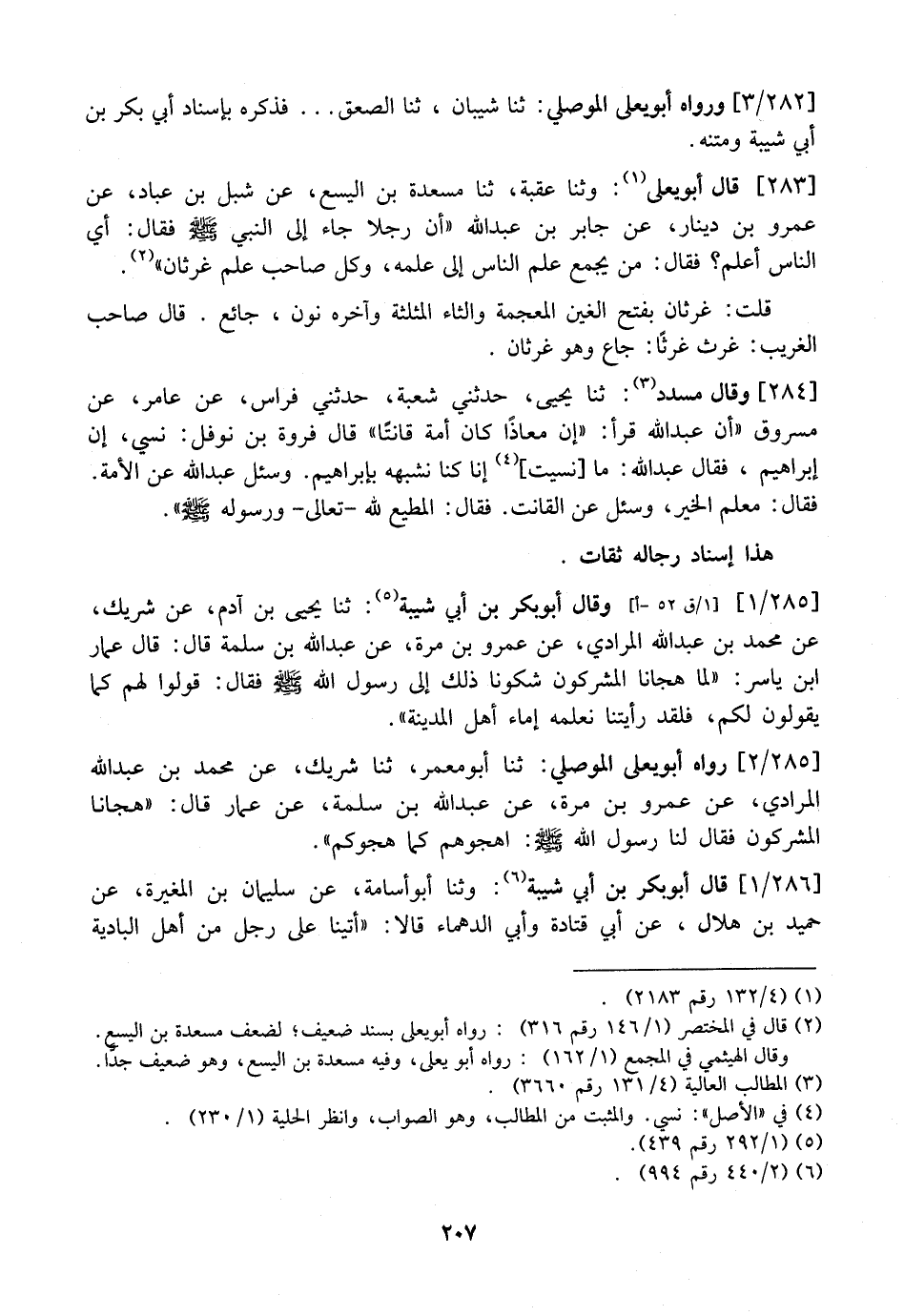 284 - وَقَالَ مُسَدَّدٌ: ثنا يَحْيَى، حَدَّثَنِي شُعْبَةُ، حَدَّثَنِي فِرَاسٌ، عَنْ عَامِرٍ، عَنْ مَسْرُوقٍ "أَنَّ عَبْدَ اللَّهِ قَرَأَ: "إِنَّ مُعَاذًا كَانَ أُمَّةً قَانِتًا" قَالَ فَرْوَةُ بْنُ نَوْفَلٍ: نَسِيَ، إِنَّ إبراهيم، فقال عبد الله: ما أنسيت، إِنَّا كُنَّا نُشَبِّهُهُ بِإِبْرَاهِيمَ. وَسُئِلَ عَبْدُ اللَّهِ عَنِ الْأُمَّةِ. فَقَالَ: مُعَلِّمُ الْخَيْرِ، وَسُئِلَ عَنِ القانت. فقال: الْمُطِيعُ لِلَّهِ- تَعَالَى- وَرَسُولِهِ - صَلَّى اللَّهُ عَلَيْهِ وَسَلَّمَ -".