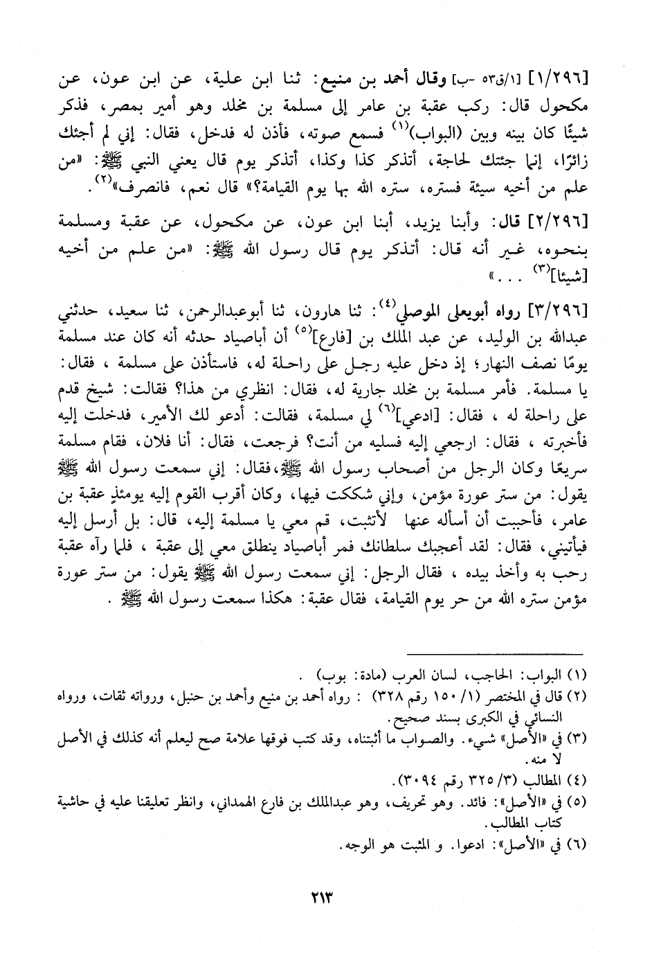 296 / 1 - وَقَالَ أَحْمَدُ بْنُ مَنِيعٍ: ثَنَا ابْنُ عُلَيَّةَ، عَنِ ابْنِ عَوْنٍ، عَنْ مَكْحُولٍ قَالَ: رَكِبَ عُقْبَةُ بْنُ عَامِرٍ إِلَى مَسْلَمَةَ بْنِ مَخْلَدٍ وَهُوَ أَمِيرٌ بِمِصْرَ، فَذَكَرَ شَيْئًا كَانَ بَيْنَهُ وَبَيْنَ (الْبَوَّابِ) فَسَمِعَ صَوْتَهُ، فَأَذِنَ لَهُ فَدَخَلَ، فَقَالَ: إِنِّي لَمْ أَجِئْكَ زَائِرًا، إِنَّمَا جِئْتُكَ لِحَاجَةٍ، أَتَذْكُرُ كَذَا وَكَذَا، أَتَذْكُرُ يَوْمَ قَالَ يعني النَّبِيَّ - صَلَّى اللَّهُ عَلَيْهِ وَسَلَّمَ -: "مَنْ عَلِمَ من أخيه سيئة فَسَتَرَهُ، سَتَرَهُ اللَّهُ بِهَا يَوْمَ الْقِيَامَةِ؟ " قَالَ نعم، فانصرف ".