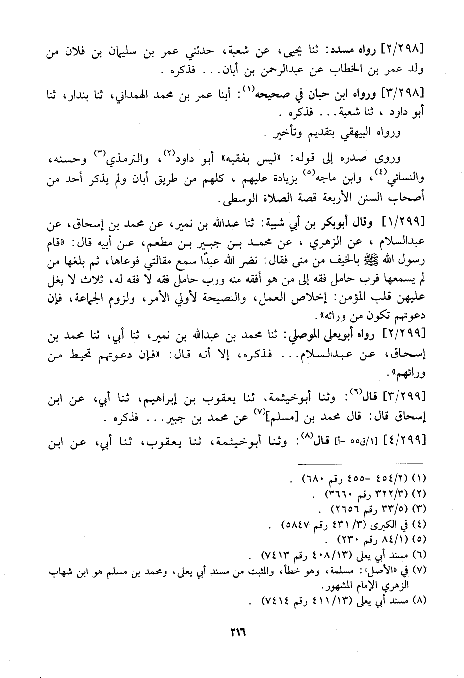 299 / 1 - وَقَالَ أَبُو بَكْرِ بْنُ أَبِي شَيْبَةَ: ثنا عَبْدُ اللَّهِ بْنُ نُمَيْرٍ، عَنْ مُحَمَّدِ بْنِ إِسْحَاقَ، عَنْ عَبْدِ السَّلَامِ، عَنِ الزُّهْرِيِّ، عَنْ مُحَمَّدِ بْنِ جُبَيْرِ بْنِ مُطْعَمٍ، عَنْ أَبِيهِ قَالَ: "قَامَ رَسُولُ اللَّهِ - صَلَّى اللَّهُ عَلَيْهِ وَسَلَّمَ - بِالْخِيفِ مِنْ مِنًى فَقَالَ: نَضَّرَ اللَّهُ عَبْدًا سَمِعَ مَقَالَتِي فَوَعَاهَا، ثُمَّ بَلَّغَهَا مَنْ لَمْ يَسْمَعْهَا فرب حامل فقه إلى من هو أفقه منه ورب حامل فقه لا فقه اله، ثَلَاثٌ لَا يَغِلُّ عَلَيْهِنَّ قَلْبُ الْمُؤْمِنُ: إِخْلَاصُ الْعَمَلِ، وَالنَّصِيحَةُ لِأُولِي الْأَمْرِ، وَلُزُومُ الْجَمَاعَةِ، فَإِنَّ دَعْوَتَهُمْ تَكُونُ مِنْ وَرَائِهِ ".