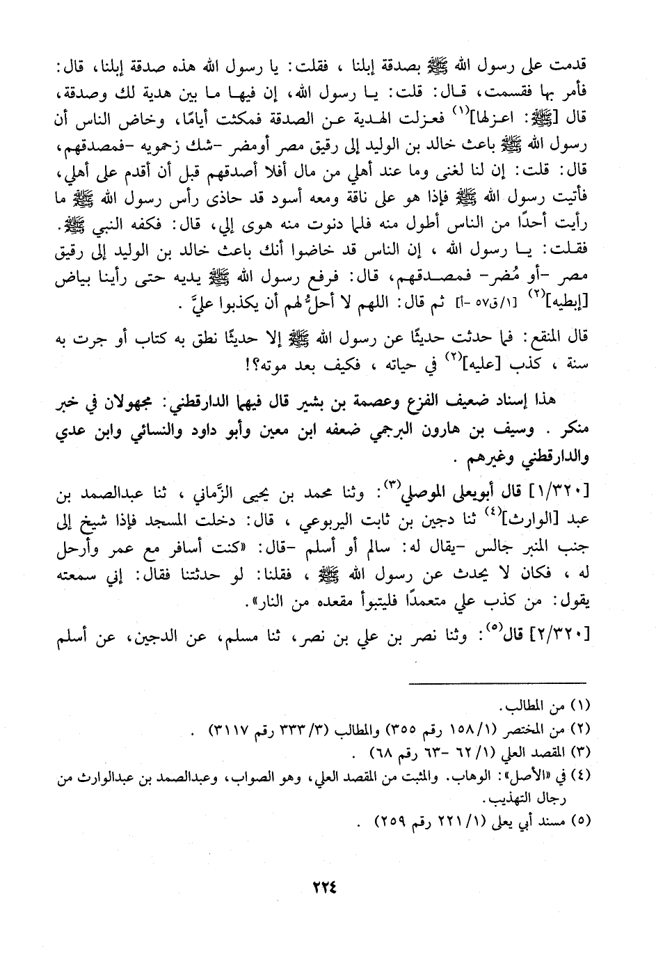 قَدِمْتُ عَلَى رَسُولِ اللَّهِ - صَلَّى اللَّهُ عَلَيْهِ وَسَلَّمَ - بِصَدَقَةِ إِبِلِنَا، فَقُلْتُ: يَا رَسُولَ اللَّهِ - صَلَّى اللَّهُ عَلَيْهِ وَسَلَّمَ - هَذِهِ صَدَقَةُ إِبِلِنَا، قَالَ: فَأَمَرَ بِهَا فَقُسِّمَتْ، قَالَ: قُلْتُ: يَا رَسُولَ اللَّهِ، إِنَّ فِيهَا ما بين هدية لك وصدقة، قال - صلى الله عليه وسلم -: أعزلها، فَعُزِلَتِ الْهَدِيَّةُ عَنِ الصَّدَقَةِ فَمَكَثْتُ أَيَّامًا، وَخَاضَ الناس أن رسول الله بَاعِثٌ خَالِدَ بْنَ الْوَلِيدِ إِلَى رَقِيقِ مِصْرَ أومضر- شك زحمويه- فَمُصَدِّقُهُمْ، قَالَ: قُلْتُ: إِنَّ لَنَا لَغِنًى وَمَا عِنْدَ أَهْلِي مِنْ مَالٍ أَفَلَا أُصَدِّقُهُمْ قَبْلَ أَنْ أَقْدَمَ عَلَى أَهْلِي، فَأَتَيْتُ رَسُولَ اللَّهِ - صَلَّى اللَّهُ عَلَيْهِ وَسَلَّمَ - فَإِذَا هُوَ عَلَى نَاقَةٍ وَمَعَهُ أَسْوَدُ قَدْ حَاذَى رَأْسَ رَسُولِ اللَّهِ - صَلَّى اللَّهُ عَلَيْهِ وَسَلَّمَ - مَا رَأَيْتُ أَحَدًا مِنَ النَّاسِ أَطْوَلَ مِنْهُ فَلَمَّا دَنَوْتُ مِنْهُ هَوِيَ إِلَيَّ، قَالَ: فَكَفَّهُ النَّبِيُّ - صَلَّى اللَّهُ عَلَيْهِ وَسَلَّمَ -. فَقُلْتُ: يَا رَسُولَ اللَّهِ، إِنَّ النَّاسَ قَدْ خَاضُوا أَنَّكَ بَاعِثٌ خَالِدَ بْنَ الْوَلِيدِ إِلَى رَقِيقِ مِصْرَ- أَوْ مُضر- فَمُصَدِّقُهُمْ، قَالَ: فَرَفَعَ رَسُولُ اللَّهِ - صَلَّى اللَّهُ عَلَيْهِ وَسَلَّمَ - يديه حتى رأينا بياض إبطيه ثُمَّ قَالَ: اللهم لَا أُحِلُّ لَهُمْ أَنْ يَكْذِبُوا عليَّ.
