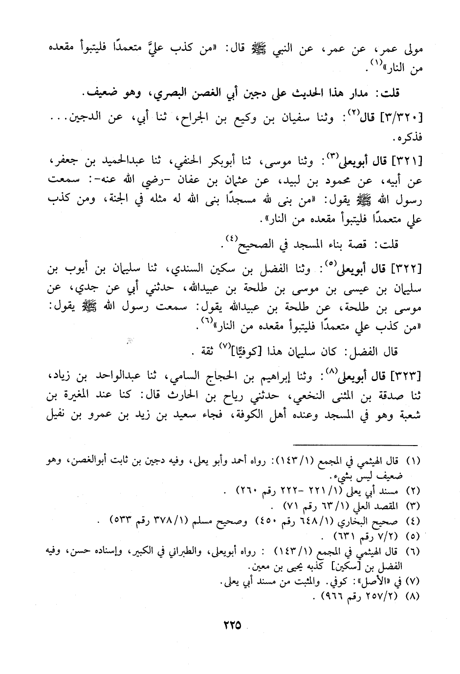 322 - قتال أَبُو يَعْلَى: وثنا الْفَضْلُ بْنُ سَكِينٍ السَّنَدِيُّ، ثنا سُلَيْمَانُ بْنُ أَيُّوبَ بْنِ سُلَيْمَانَ بْنِ عِيسَى بْنِ مُوسَى بْنِ طَلْحَةَ بْنِ عُبَيْدِ اللَّهِ، حَدَّثَنِي أَبِي عَنْ جَدِّي، عَنْ مُوسَى بْنِ طَلْحَةَ، عَنْ طَلْحَةَ بْنِ عُبَيْدِ اللَّهِ يَقُولُ: سَمِعْتُ رَسُولَ اللَّهِ - صَلَّى اللَّهُ عَلَيْهِ وسلم - قيل يَقُولُ: "مَنْ كَذَبَ عَلَيَّ مُتَعَمِّدًا فَلْيَتَبَوَّأْ مَقْعَدَهُ مِنَ النَّارِ".