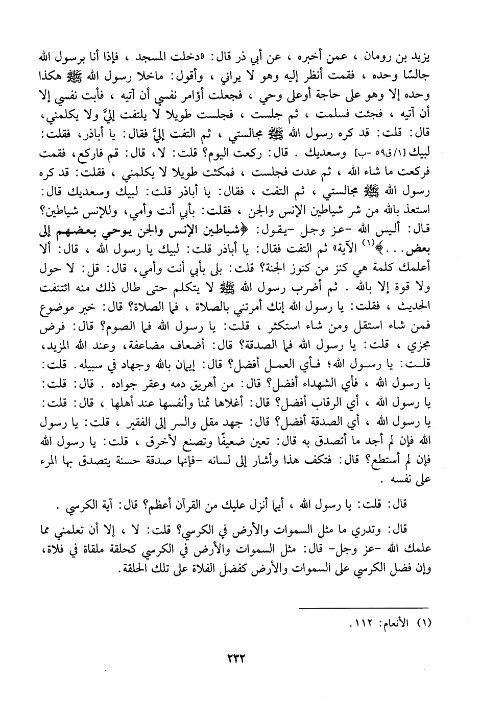 يزيد بن رومان، عمن أَخْبَرَهُ، عَنْ أَبِي ذَرٍّ قَالَ: "دَخَلْتُ الْمَسْجِدَ، فَإِذَا أَنَا بِرَسُولِ اللَّهِ جَالِسًا وَحْدَهُ، فَقُمْتُ أنظر إليه وهو لا يراني، وأقول: ماخلا رَسُولُ اللَّهِ - صَلَّى اللَّهُ عَلَيْهِ وَسَلَّمَ - هَكَذَا وحده إلا وهو على حاجة أوعلى وحي، فجعلت أؤامر نَفْسِي أَنْ آتِيهِ، فَأَبَتْ نَفْسِي إِلَّا أَنْ آتِيهِ، فَجِئْتُ فَسَلَّمْتُ، ثُمَّ جَلَسْتُ، فَجَلَسْتُ طَوِيلًا لَا يَلْتَفِتُ إليَّ وَلَا يُكَلِّمُنِي، قَالَ: قُلْتُ: قَدْ كَرِهَ رَسُولُ اللَّهِ - صَلَّى اللَّهُ عَلَيْهِ وسلم - مجالستي، ثم التفت إليَّ فقال: يا أباذر، فقلت: لبيك وسعديك. قالت: ركعت الْيَوْمَ؟ قُلْتُ: لَا، قَالَ: قُمْ فَارْكَعْ، فَقُمْتُ فَرَكَعْتُ مَا شَاءَ اللَّهُ، ثُمَّ عُدْتُ فَجَلَسْتُ، فمكثت طويلا لا يكلمني، فقلت: قدكره رَسُولُ اللَّهِ - صَلَّى اللَّهُ عَلَيْهِ وَسَلَّمَ - مُجَالَسَتِي، ثم التفت، فقال: يا أباذر قُلْتُ: لَبَّيْكَ وَسَعْدَيْكَ قَالَ: اسْتَعِذْ بِاللَّهِ مِنْ شر شياطين الإنس والجن، فقلت: بأبي أنت وأمي، وللإنس شياطين؟ قالت: أَلَيْسَ اللَّهُ- عَزَّ وَجَلَّ- يَقُولُ: {شَيَاطِينَ الإِنْسِ والجن يوحي بعضهم إلى بعض ... } الاية" ثم التفت فقال: يا أباذر قُلْتُ: لَبَّيَكَ يَا رَسُولَ اللَّهِ، قَالَ: أَلَا أُعَلِّمُكَ كَلِمَةً هِيَ كَنْزٌ مِنْ كُنُوزِ الْجَنَّةِ؟ قُلْتُ: بَلَى بِأَبِي أَنْتَ وَأُمِّي، قَالَ: قُلْ: لَا حَوْلَ وَلَا قُوَّةَ إِلَّا بِاللَّهِ. ثُمَّ أَضْرَبَ رَسُولُ اللَّهِ- صَلَّى اللَّهُ عَلَيْهِ وَسَلَّمَ - لَا يتكلم حتى طال ذلك منه ائتنفت الْحَدِيثَ، فَقُلْتُ: يَا رَسُولَ اللَّهِ إِنَّكَ أَمَرْتَنِي بِالصَّلَاةِ، فَمَا الصَّلَاةُ؟ قَالَ: خَيْرُ مَوْضُوعٍ فَمَنْ شَاءَ اسْتَقَلَّ وَمَنْ شَاءَ اسْتَكْثَرَ، قُلْتُ: يَا رسول الله فما الصوم؟ قال: فرض مجزي، قُلْتُ: يَا رَسُولَ اللَّهِ فَمَا الصَّدَقَةُ؟ قَالَ: أَضْعَافٌ مُضَاعَفَةٌ، وَعِنْدَ اللَّهِ الْمَزِيدُ، قُلْتُ: يَا رَسُولَ اللَّهِ - صَلَّى اللَّهُ عَلَيْهِ وَسَلَّمَ - " فَأَيُّ الْعَمَلِ أَفْضَلُ؟ قَالَ: إِيمَانٌ بِاللَّهِ وَجِهَادٌ فِي سَبِيلِهِ. قُلْتُ: يَا رَسُولَ اللَّهِ، فَأَيُّ الشُّهَدَاءِ أَفْضَلُ؟ قَالَ: مَنْ أُهْرِيقَ دَمُهُ وَعُقِرَ جَوَادُهُ. قَالَ: قُلْتُ: يَا رَسُولَ اللَّهِ، أَيُّ الرِّقَابِ أَفْضَلُ؟ قَالَ: أَغْلَاهَا ثَمَنًا وَأَنْفَسُهَا عِنْدَ أَهْلِهَا، قَالَ: قُلْتُ: يَا رَسُولَ اللَّهِ، أَيُّ الصَّدَقَةِ أَفْضَلُ؟ قَالَ: جُهْدُ مُقِلٍّ وَالسِّرُّ إِلَى الْفَقِيرِ، قُلْتُ: يَا رَسُولَ اللَّهِ فَإِنْ لَمْ أجد ما أتصدق به قال: تعين ضعيفًا وتصنع لأخرق، قُلْتُ: يَا رَسُولَ اللَّهِ - صَلَّى اللَّهُ عَلَيْهِ وَسَلَّمَ - فَإِنْ لَمْ أَسْتَطِعْ؟ قَالَ: فَتَكُفَّ هَذَا وَأَشَارَ إِلَى لِسَانِهِ- فَإِنَّهَا صَدَقَةٌ حَسَنَةٌ يَتَصَدَّقُ بِهَا الْمَرْءُ عَلَى نَفْسِهِ.