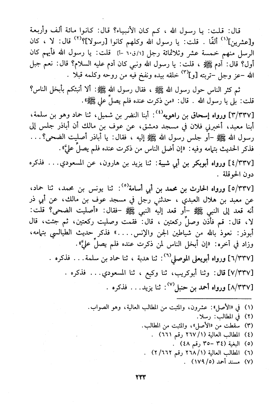 337 / 5 - وَرَوَاهُ الْحَارِثُ بْنُ مُحَمَّدِ بْنِ أَبِي أُسَامَةَ: ثنا يونس بن محمد، ثنا حَمَّادٌ، عَنْ مَعْبَدِ بْنِ هِلَالٍ الْعَبْدِيِّ، حَدَّثَنِي رَجُلٌ فِي مَسْجِدِ عْوَفِ بْنِ مَالِكٍ، عَنْ أَبِي ذَرٍّ أَنَّهُ قَعَدَ إِلَى النَّبِيِّ - صَلَّى اللَّهُ عَلَيْهِ وَسَلَّمَ - أَوْ قَعَدَ إِلَيْهِ النَّبِيُّ - صَلَّى اللَّهُ عَلَيْهِ وَسَلَّمَ - فَقَالَ: "أَصَلَّيْتَ الضُّحَى؟ قُلْتُ: لَا، قَالَ: قُمْ فَأَذِّنْ وصلِّ رَكْعَتَيْنِ، قَالَ: فَقُمْتُ وَصَلَّيْتُ رَكْعَتَيْنِ، ثُمَّ جِئْتُ، قَالَ أبو ذر: نعوذ بِاللَّهِ مِنْ شَيَاطِينِ الْجِنِّ وَالْإِنْسِ.... " فَذَكَرَ حَدِيثَ الطَّيَالِسِيِّ بِتَمَامِهِ، وَزَادَ فِي آخِرِهِ: "إِنَّ أَبْخَلَ النَّاسِ لَمَنْ ذُكِرْتُ عِنْدَهُ فَلَمْ يصلِّ عليَّ ".