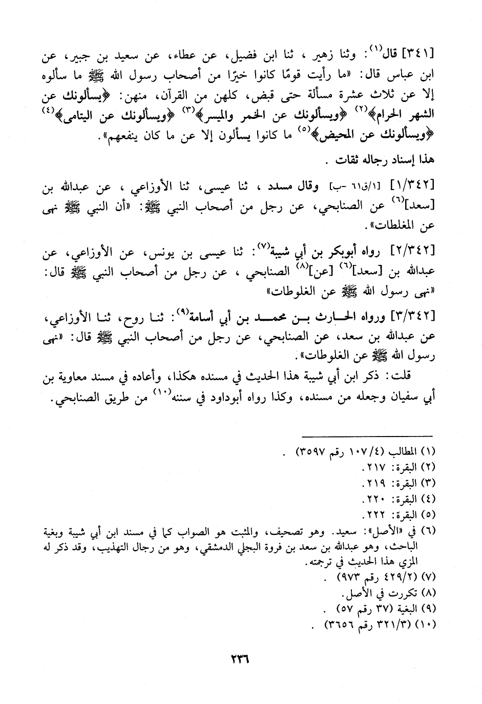342 / 1 - وَقَالَ مُسَدَّدٌ، ثَنَا عِيسَى، ثنا الْأَوْزَاعِيُّ، عْنَ عْبَدِ اللَّهِ بْنِ سْعَدٍ عَنِ الصَّنَابِحِيِّ، عْنَ رَجُلٍ مِنْ أَصْحَابِ النَّبِيِّ - صَلَّى اللَّهُ عَلَيْهِ وَسَلَّمَ -: "أَنَّ النَّبِيَّ - صَلَّى اللَّهُ عَلَيْهِ وَسَلَّمَ - نَهَى عن الْمَغْلُطَاتِ ".