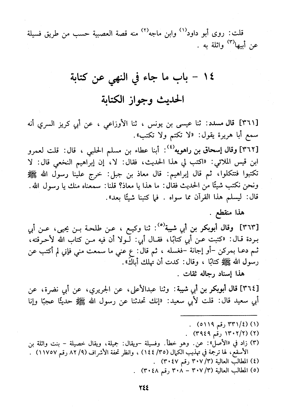 363 - وَقَالَ أَبُو بَكْرِ بْنُ أَبِي شَيْبَةَ: ثنا وَكِيعٌ، عَنْ طَلْحَةَ بْنِ يَحْيَى، عْنَ أَبِي بُرْدَةَ قَالَ: "كَتَبْتُ عَنْ أَبِي كِتَابًا، فَقَالَ أَبِي: لَوْلَا أَنَّ فِيهِ مِنْ كِتَابِ اللَّهِ لَأَحْرَقْتُهُ، ثُمَّ دَعَا بِمَرْكَنٍ- أَوْ إِجَانَةٍ- فَغَسَلَهُ، ثُمَّ قال: عِ عَنِّي مَا سَمِعْتَ مِنِّي فَإِنِّي لَمْ أَكْتُبْ عَنْ رَسُولِ اللَّهِ - صَلَّى اللَّهُ عَلَيْهِ وَسَلَّمَ - كِتَابًا، وَقَالَ: كِدْتَ أَنْ تُهْلِكَ أباكَ ".