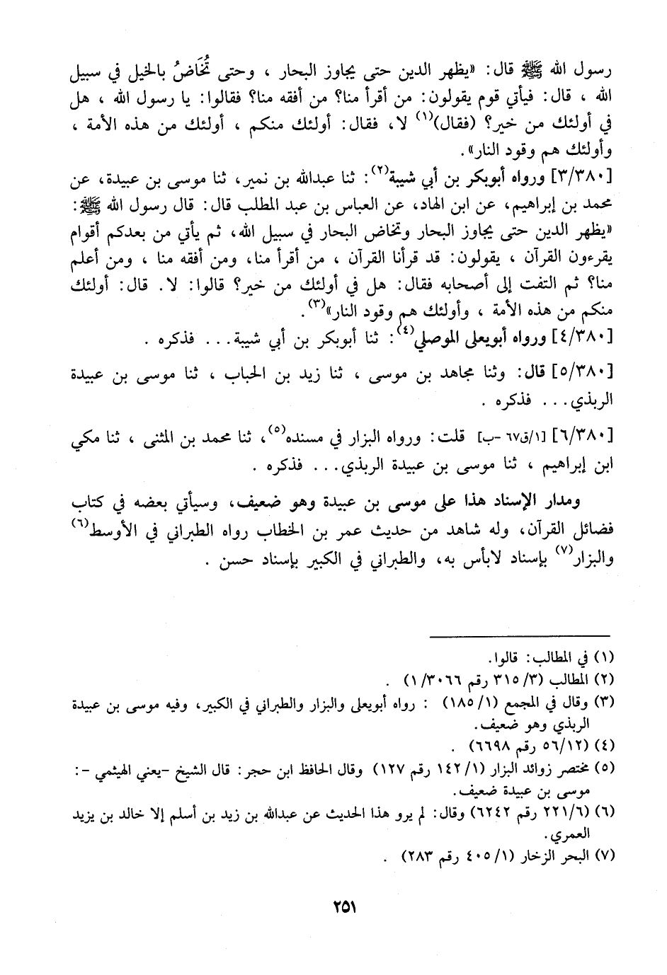 380 / 3 - وَرَوَاهُ أَبُو بَكْرِ بْنُ أَبِي شَيْبَةَ: ثَنَا عَبْدُ اللَّهِ بْنُ نُمَيْرٍ، ثَنَا مُوسَى بْنُ عُبَيْدَةَ، عَنْ مُحَمَّدِ بْنِ إِبْرَاهِيمَ، عَنِ ابْنِ الْهَادِ، عَنِ الْعَبَّاسِ بْنِ عْبَدِ الْمُطَّلِبِ قَالَ: قَالَ رَسُولُ اللَّهِ - صَلَّى اللَّهُ عَلَيْهِ وَسَلَّمَ -: "يَظْهَرُ الدِّينُ حتى يجاوز البحار وتخاض الْبِحَارُ فِي سَبِيلِ اللَّهِ، ثُمَّ يَأْتِي مَنْ بَعْدِكُمْ أَقْوَامٌ يَقْرَءُونَ الْقُرآنَ، يَقُولُونَ: قَدْ قَرَأْنَا الْقُرْآنَ، مَنْ أَقْرَأُ مِنَّا، وَمَنْ أَفْقَهُ مِنَّا، وَمَنْ أَعْلَمُ مِنَّا؟ ثُمَّ الْتَفَتَ إِلَى أَصْحَابِهِ فَقَالَ: هَلْ فِي أُولَئِكَ مِنْ خَيْرٍ؟ قَالُوا: لَا. قَالَ: أُولَئِكَ مِنْكُمْ مِنْ هَذِهِ الْأُمَّةِ، وَأُولَئِكَ هو وَقُودُ النَّارِ".