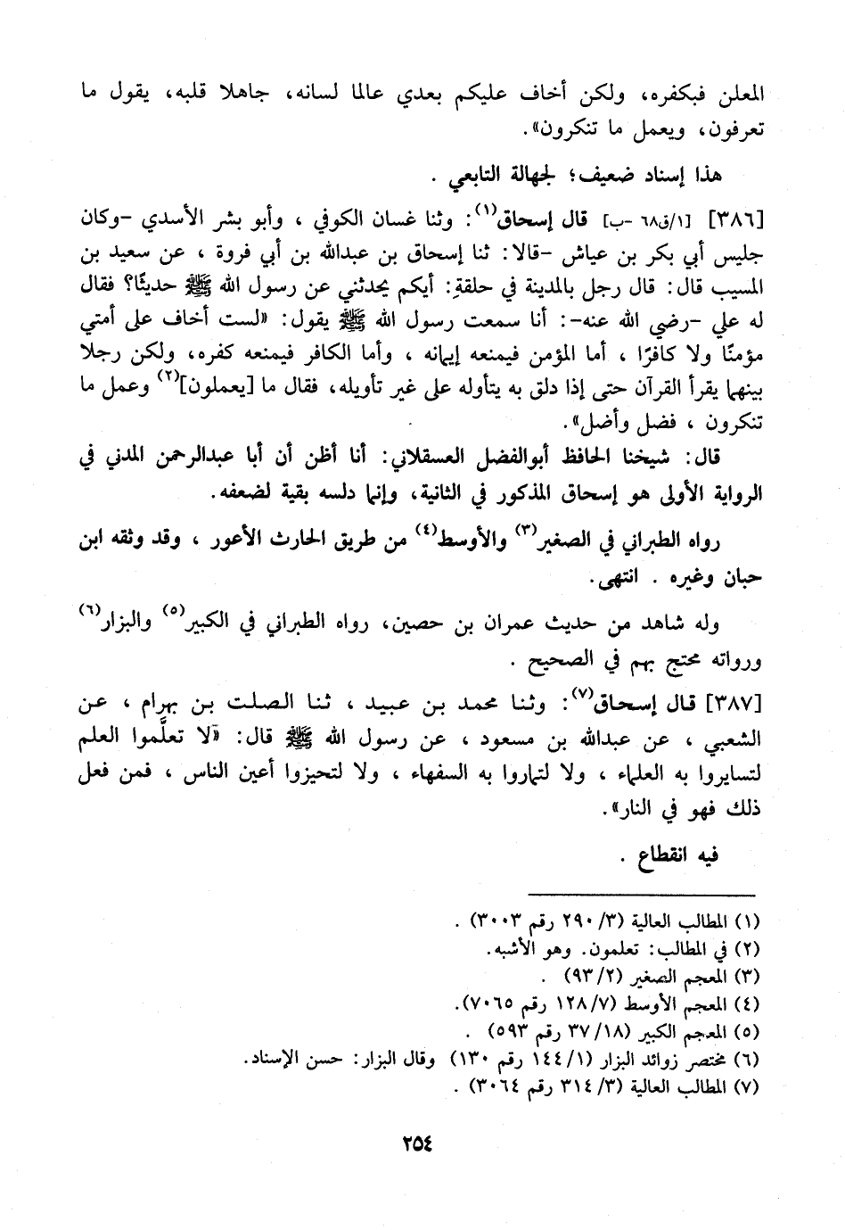 387 - قال إسحاق: وثنا مُحَمَّدُ بْنُ عُبَيْدٍ، ثنا الصَّلْتُ بْنُ بِهْرَامٍ، عَنِ الشَّعْبِيِّ، عْنَ عَبْدِ اللَّهِ بْنِ مَسْعُودٍ، عَنْ رَسُولِ اللَّهِ - صَلَّى اللَّهُ عَلَيْهِ وَسَلَّمَ - قَالَ: "لَا تعلَّموا الْعِلْمَ لِتُسَايِرُوا بِهِ الْعُلَمَاءَ، ولا لتماروا به السفهاء، ولا لتحيزوا أَعْيُنَ النَّاسَ، فَمَنْ فَعَلَ ذَلِكَ فَهُوَ فِي النَّارِ".