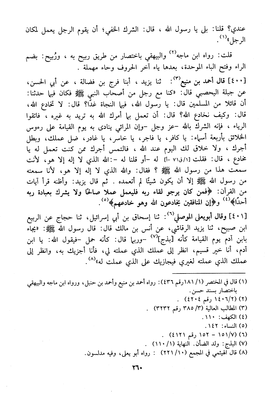 400 - قَالَ أَحْمَدُ بْنُ مَنِيعٍ: ثنا يزيد، أبنا فَرَجُ بْنُ فَضَالَةِ، عَنْ أَبِي الْحَسَنِ، عَنْ جَبِلَةَ الْيَحْصَبِيِّ قَالَ: "كُنَّا مَعَ رَجُلٍ مِنْ أَصْحَابِ النَّبِيِّ - صَلَّى اللَّهُ عَلَيْهِ وَسَلَّمَ - فَكَانَ فِيمَا حَدَّثَنَا: أنَّ قَائِلًا مِنَ الْمُسْلِمِينَ قَالَ: يا رسول الله، فيما النَّجَاةُ غَدًا؟ قَالَ: لَا تُخَادِعِ اللَّهَ، قَالَ: وَكَيْفَ نُخَادِعُ اللَّهَ؟ قَالَ: أَنْ تَعْمَلَ بِمَا أَمَرَكَ اللَّهُ بِهِ تُرِيدُ بِهِ غَيْرَهُ، فَاتَّقُوا الرِّيَاءَ، فَإِنَّهُ الشِّرْكُ بِاللَّهِ- عَزَّ وَجَلَّ- وَإِنَّ الْمُرَائِيَ يُنَادَى بِهِ يَوْمَ الْقِيَامَةِ عَلَى رُءُوسِ الْخَلَائِقِ بِأَرْبَعَةِ أَسْمَاءٍ: يَا كَافِرُ، يَا فَاجِرُ، يَا خَاسِرُ، يَا غَادِرُ، ضَلَّ عَمَلُكَ، وَبَطَلَ أَجْرُكَ، وَلَا خَلَاقَ لَكَ الْيَوْمَ عِنْدَ اللَّهِ، فَالْتَمِسْ أَجْرَكَ مِمَّنْ كُنْتَ تَعْمَلُ لَهُ يَا مخادع، قال: فقلت - أو قلنا له-: الله الَّذِي لَا إِلَهَ إِلَّا هُوَ، لَأَنْتَ سَمِعْتَ هَذَا مِنْ رَسُولِ اللَّهِ - صَلَّى اللَّهُ عَلَيْهِ وَسَلَّمَ -؟ فَقَالَ: وَاللَّهِ الَّذِي لَا إِلَهَ إِلَّا هُوَ، لَأَنَا سَمِعْتُهُ مِنْ رَسُولِ اللَّهِ - صَلَّى اللَّهُ عَلَيْهِ وَسَلَّمَ -؟ إِلَّا أَنْ يَكُونَ شَيْئًا لَمْ أَتَعَمَّدْهُ. ثُمَّ قَالَ يَزِيدُ: وَأَظُنُّهُ قَرَأَ آيَاتٍ مِنَ الْقُرْآنِ: {فَمَنْ كَانَ يَرْجُو لِقَاءَ رَبِّهِ فَلْيَعْمَلْ عَمَلا صَالِحًا وَلا يُشْرِكْ بِعِبَادَةِ ربه أحدًا} وَ {إِنَّ الْمُنَافِقِينَ يُخَادِعُونَ اللَّهَ وَهُوَ خَادِعُهُمْ} .