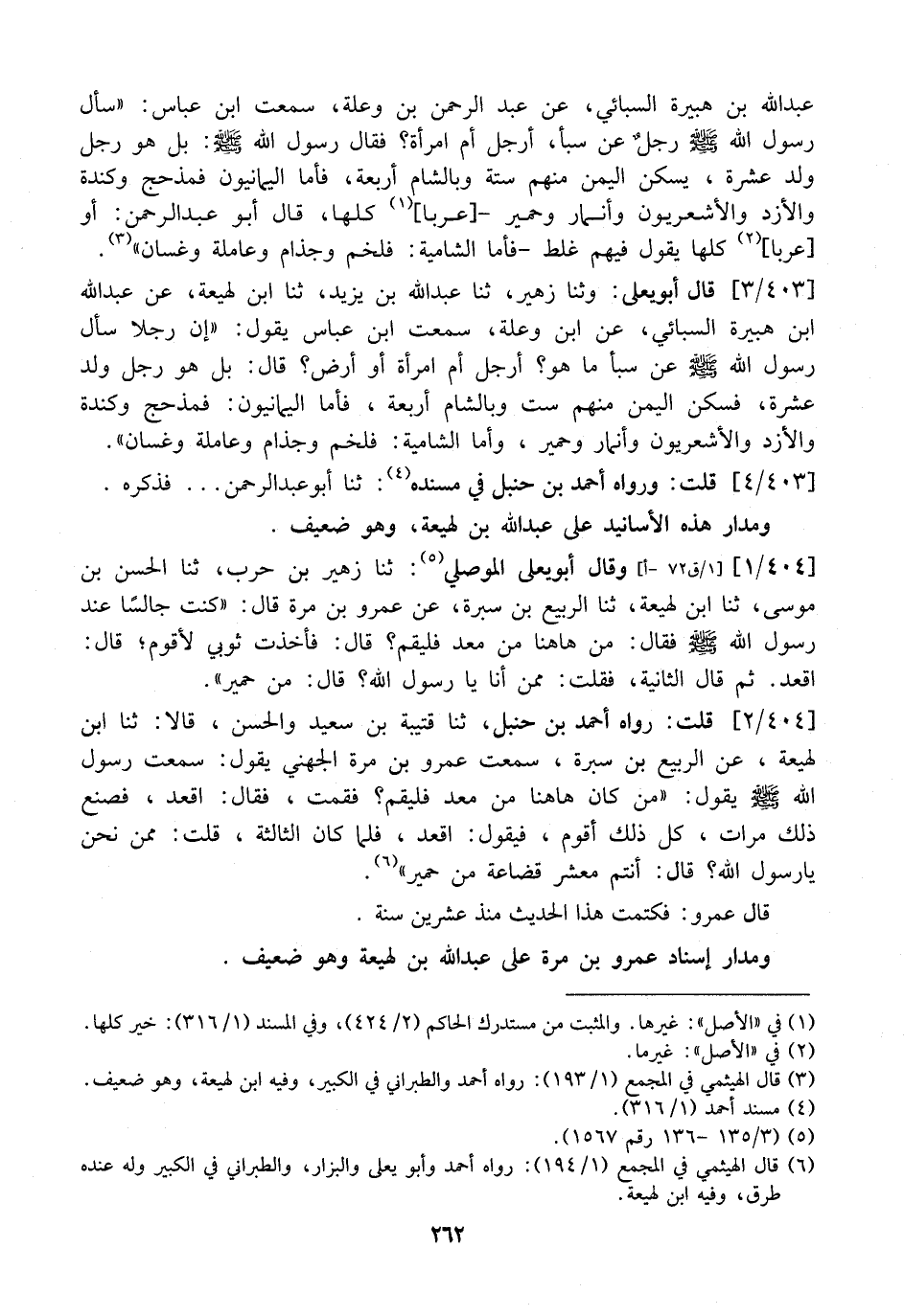 404 / 2 - قُلْتُ: رَوَاهُ أَحْمَدُ بن حنبل، ثنا قتيبة بيت سَعِيدٍ وَالْحَسَنُ، قَالَا: ثنا ابْنُ لَهِيعَةَ، عَنِ الرَّبِيعِ بْنِ سَبْرَةَ، سَمِعْتُ عَمْرَو بْنَ مُرَّةَ الْجُهَنِيَّ يَقُولُ: سَمِعْتُ رَسُولَ اللَّهِ - صَلَّى اللَّهُ عَلَيْهِ وَسَلَّمَ - يَقُولُ: "مَنْ كَانَ هَاهُنَا مِنْ مَعَدٍّ فَلْيَقُمْ؟ فَقُمْتُ، فَقَالَ: اقْعُدْ، فَصَنَعَ ذَلِكَ مَرَّاتٍ، كُلُّ ذَلِكَ أَقُومُ، فَيَقُولُ: اقْعُدْ، فَلَمَّا كان الثالثة، قلت: ممن نحن يارسول اللَّهِ؟ قَالَ: أَنْتُمْ مَعْشَرَ قُضَاعَةَ مِنْ حِمْيَرَ".