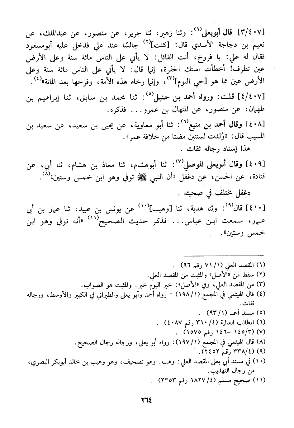409 - وَقَالَ أَبُو يَعْلَى الْمَوْصِلِيُّ: ثَنَا أَبُو هِشَامٍ، ثنا مُعَاذُ بْنُ هِشَامٍ، ثنا أَبِي، عَنْ قَتَادَةَ، عَنِ الْحَسَنِ، عَنْ دَغْفَلٍ "أَنَّ النَّبِيَّ - صَلَّى اللَّهُ عَلَيْهِ وَسَلَّمَ - تُوُفِّيَ وَهُوَ ابْنُ خَمْسٍ وَسِتِّينَ ".