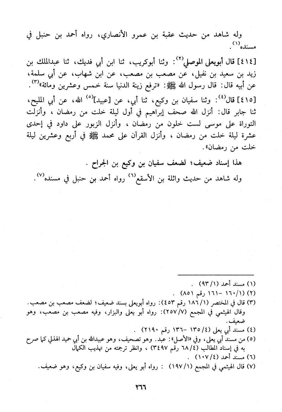 415 - قَالَ: وَثنا سُفْيَانُ بْنُ وَكِيعٍ، ثَنَا أَبِي، عَنْ عبيد اللَّهِ، عَنْ أَبِي الْمَلِيحِ، ثنا جَابِرٌ قَالَ: أَنْزَلَ اللَّهُ صُحُفَ إِبْرَاهِيمَ فِي أَوَّلِ لَيْلَةٍ خَلَتْ مِنْ رَمَضَانَ، وَانْزِلَتِ التَّوْرَاةُ عَلَى مُوسَى لِسِتٍّ خَلَوْنَ مِنْ رَمَضَانَ، وَأُنْزِلَ الزَّبُورُ عَلَى دَاوُدَ فِي إِحْدَى عَشْرَةَ لَيْلَةً خَلَتْ مِنْ رمضان، وأنزلت القرآن على محمد فِي أَرْبَعٍ وَعِشْرِينَ لَيْلَةً خَلَتْ مِنْ رَمَضَانَ ".