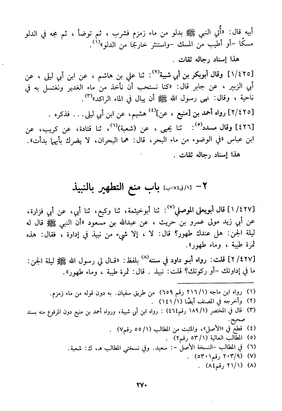427 / 1 - قَالَ أَبُو يَعْلَى الْمَوْصِلِيُّ: ثَنَا أَبُو خَيْثَمَةَ، ثَنَا وَكِيعٌ، ثَنَا أَبِي، عَنْ أَبِي فَزَارَةَ، عَنْ أَبِي زَيْدٍ مَوْلَى عَمْرِو بْنِ حُرَيْثٍ، عَنْ عَبْدِ اللَّهِ بْنِ مَسْعُودٍ "أَنّ النَّبِيَّ - صَلَّى اللَّهُ عَلَيْهِ وَسَلَّمَ - قَالَ لَهُ لَيْلَةَ الْجِنِّ: هَلْ عِنْدَكَ طَهُورٌ؟ قَالَ: لَا، إِلَّا شَيءٌ مِنْ نَبِيذٍ فِي إِدَاوَةٍ، فَقَالَ: هذه ثمرة طَيِّبَةٌ، وَمَاءٌ طَهُورٌ".