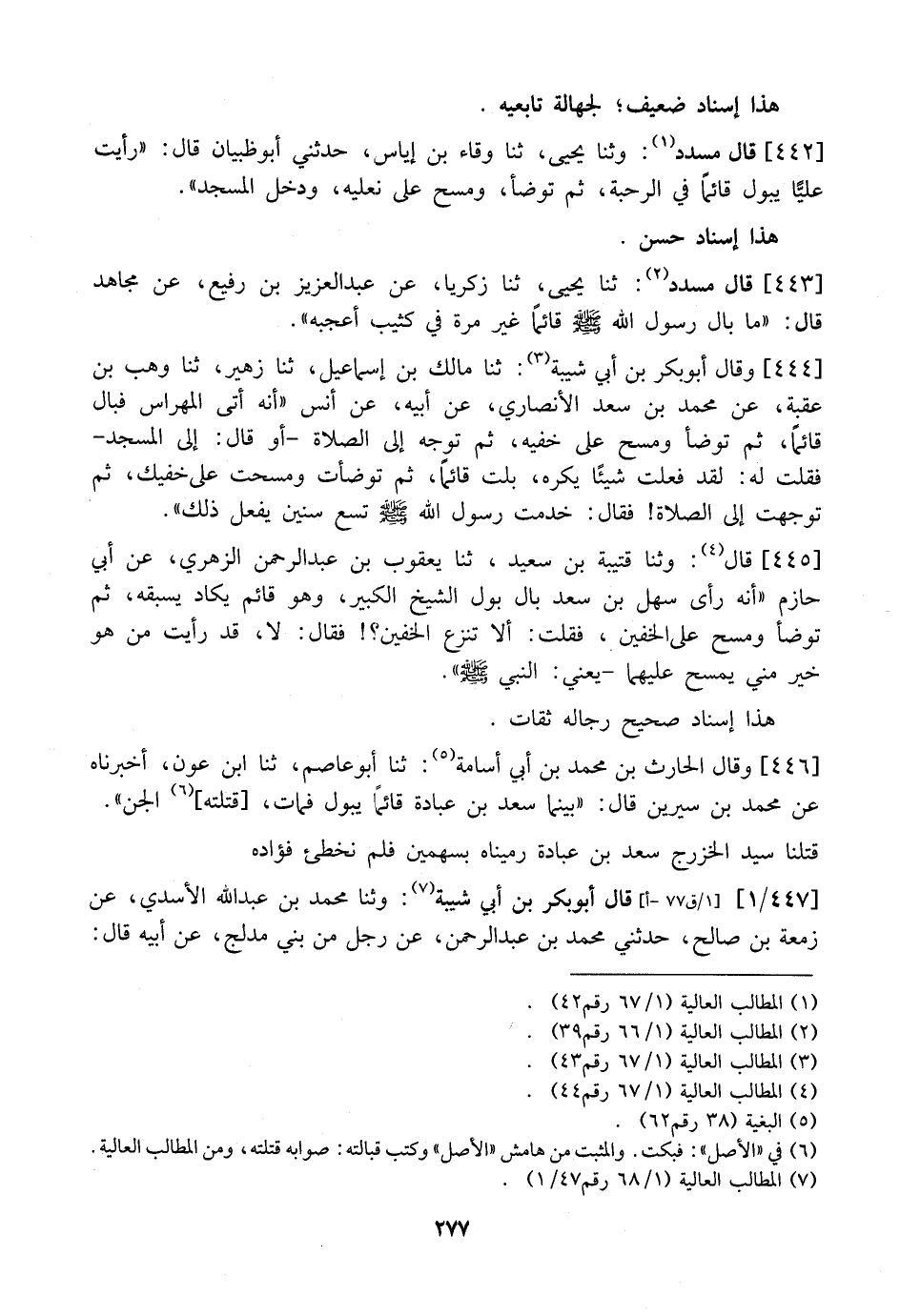 442 - قَالَ مُسَدَّدٌ: وثنا يَحْيَى، ثنا وِقَاءُ بْنُ إِيَاسٍ، حَدَّثَنِي أَبُو ظَبْيَانَ قَالَ: "رَأَيْتُ عَلِيًّا يَبُولُ قَائِمًا فِي الرَّحْبَةِ، ثُمَّ تَوَضَّأَ، وَمَسَحَ عَلَى نَعْلَيْهِ، وَدَخَلَ الْمَسْجِدَ".