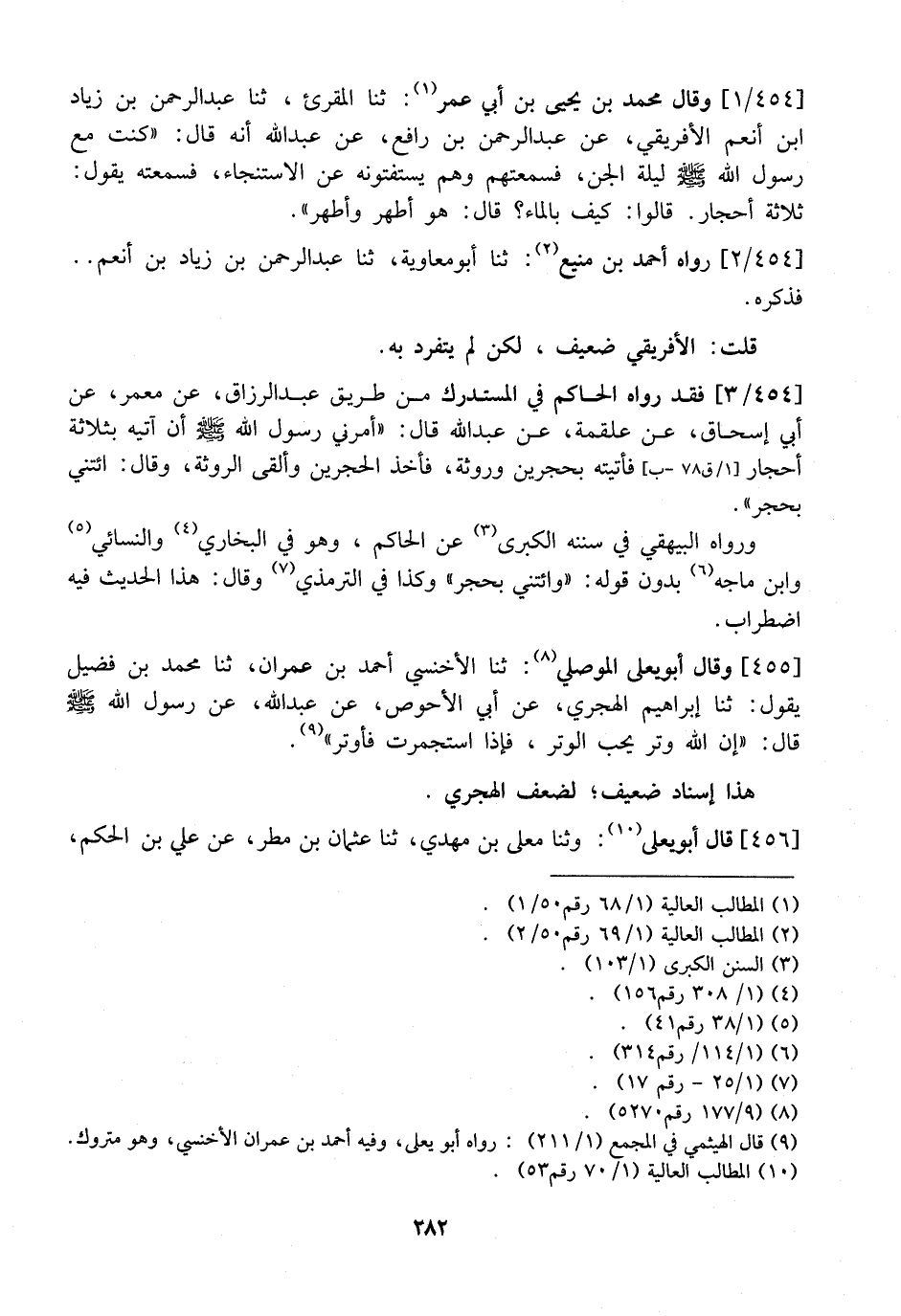 455 - وَقَالَ أَبُو يَعْلَى الْمَوْصِلِيُّ: ثنا الْأَخْنَسِيُّ أَحْمَدُ بْنُ عِمْرَانَ، ثَنَا مُحَمَّدُ بْنُ فضيل يَقُولُ: ثنا إِبْرَاهِيمُ الْهَجَرِيُّ، عَنْ أَبِي الْأَحْوَصِ، عَنْ عَبْدِ اللَّهِ، عَنْ رَسُولِ اللَّهِ - صَلَّى اللَّهُ عَلَيْهِ وَسَلَّمَ - قَالَ: "إِنَّ اللَّهَ وِتْرٌ يُحِبُّ الْوِتْرَ، فَإِذَا اسْتَجْمَرْتَ فَأَوْتِرْ".