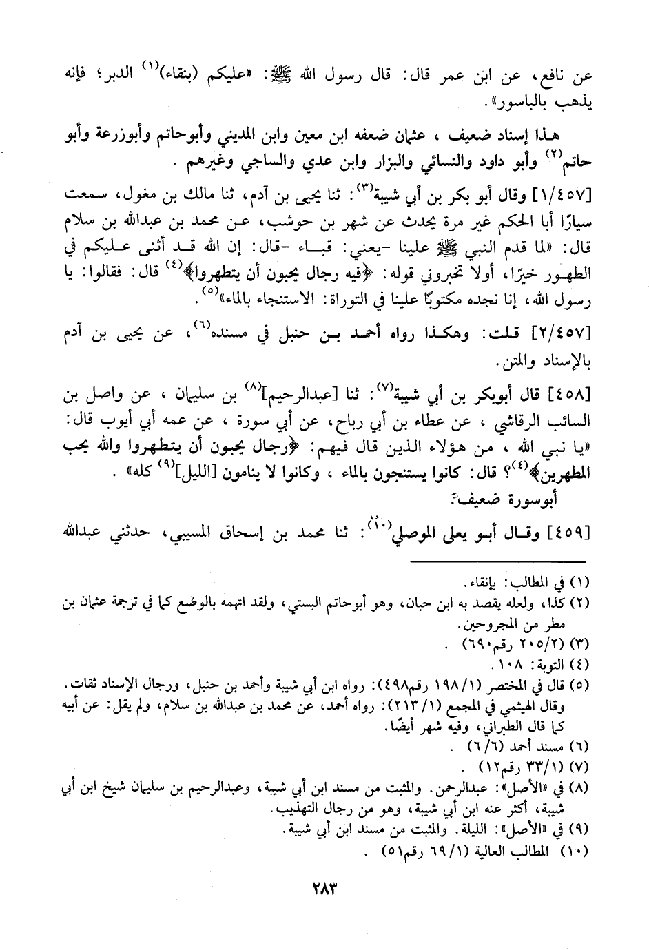 457 / 1 - وَقَالَ أَبُو بَكْرِ بْنُ أَبِي شَيْبَةَ: ثنا يَحْيَى بْنُ آدَمَ، ثَنَا مَالِكُ بْنُ مِغْوَلٍ، سَمِعْتُ سَيَّارًا أَبَا الْحَكَمِ غَيْرَ مَرَّةٍ يُحَدِّثُ عَنْ شَهْرِ بْنِ حَوْشَبٍ، عَنْ مُحَمَّدِ بْنِ عَبْدِ اللَّهِ بْنِ سَلَامٍ قَالَ: "لَمَّا قَدِمَ النَّبِيُّ - صَلَّى اللَّهُ عَلَيْهِ وَسَلَّمَ - عَلَيْنَا- يَعْنِي: قُبَاءً- قَالَ: إِنَّ اللَّهَ قَدْ أَثْنَى عَلَيْكُمْ فِي الطَّهُورِ خَيْرًا، أَوَلَا تُخْبِرُونِي قَوْلَهُ: {فيه رجال يحبون أن يتطهروا} قال: فقالوا: يا رسول الله، إنا نَجِدْهُ مَكْتُوبًا عَلَيْنَا فِي التَّوْرَاةِ: الِاسْتِنْجَاءُ بِالْمَاءِ".