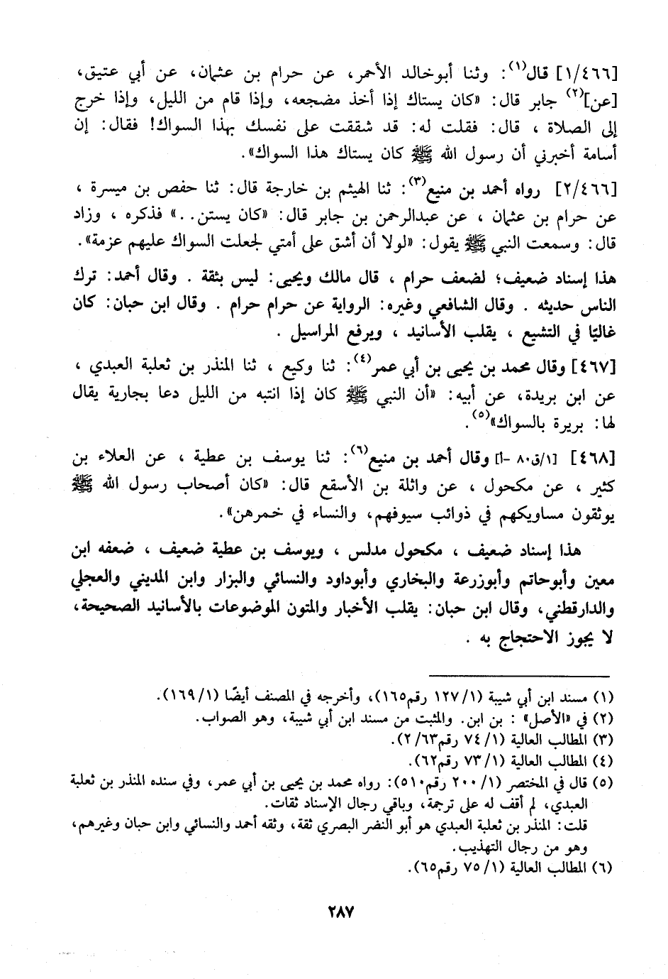 466 / 2 - رَوَاهُ أَحْمَدُ بْنُ مَنِيعٍ: ثَنَا الْهَيْثَمُ بْنُ خَارِجَةَ قَالَ: ثَنَا حَفْصُ بْنُ مَيْسَرَةَ، عَنْ حَرَامِ بْنِ عُثْمَانَ، عَنْ عَبْدِ الرَّحْمَنِ بْنِ جَابِرٍ قَالَ: "كَانَ يَسْتَنُّ.. " فَذَكَرَهُ، وَزَادَ قَالَ: وَسَمِعْتُ النَّبِيَّ - صَلَّى اللَّهُ عَلَيْهِ وَسَلَّمَ - يَقُولُ: "لَوْلَا أَنْ أَشُقَّ عَلَى أُمَّتِي لَجَعَلْتُ السِّوَاكَ عَلَيْهِمْ عَزْمَةً".