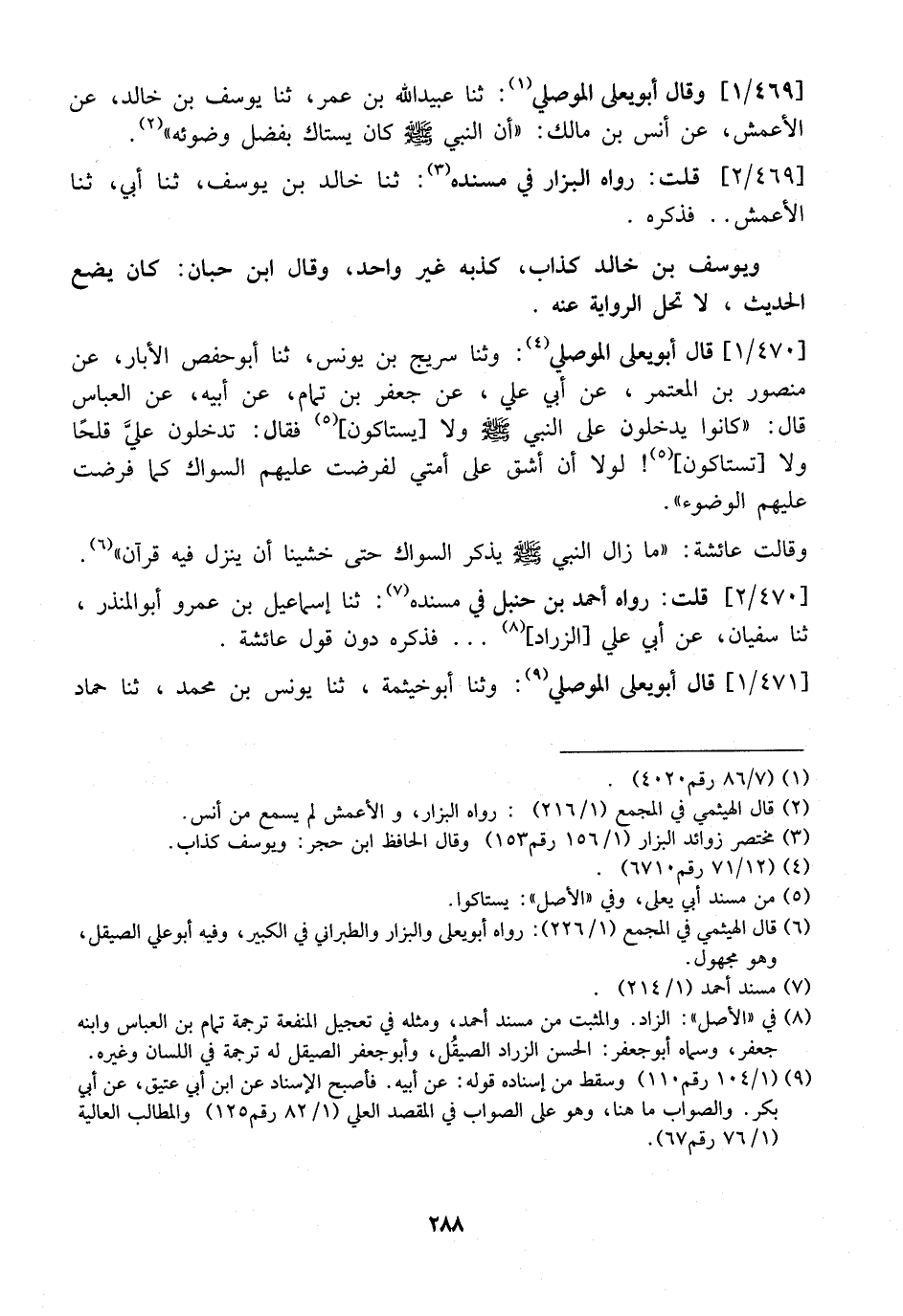469 / 1 - وَقَالَ أَبُو يَعْلَى الْمَوْصِلِيُّ: ثَنَا عُبَيْدُ اللَّهِ بْنُ عُمَرَ، ثَنَا يُوسُفُ بْنُ خَالِدٍ، عَنِ أَنَسِ بْنِ مَالِكٍ: "أَنَّ النَّبِيَّ - صَلَّى اللَّهُ عَلَيْهِ وَسَلَّمَ - كَانَ يَسْتَاكُ بِفَضْلِ وُضُوئِهِ ".