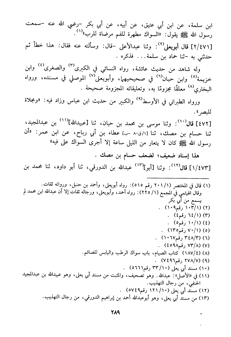 472 - قَالَ: وَثَنَا مُوسَى بْنُ مُحَمَّدِ بْنِ حَيَّانَ، ثَنَا عُبَيْدُ اللَّهِ بْنُ عَبْدِ الْمَجِيدِ، ثَنَا حُسَامُ بْنُ مِصَكٍّ ثنا عَطَاءُ بْنُ أَبِي رَبَاحٍ، عَنِ ابْنِ عُمَرَ: "أَنَّ رَسُولَ اللَّهِ - صَلَّى اللَّهُ عَلَيْهِ وَسَلَّمَ - كَانَ لَا يَتَعَارَّ مِنَ اللَّيْلِ سَاعَةً إِلَّا أَجْرَى السِّوَاكَ عَلَى فِيهِ " هَذَا إِسْنَادٌ ضَعِيفٌ؟ لِضَعْفِ حُسَامِ بْنِ مِصَكٍّ.