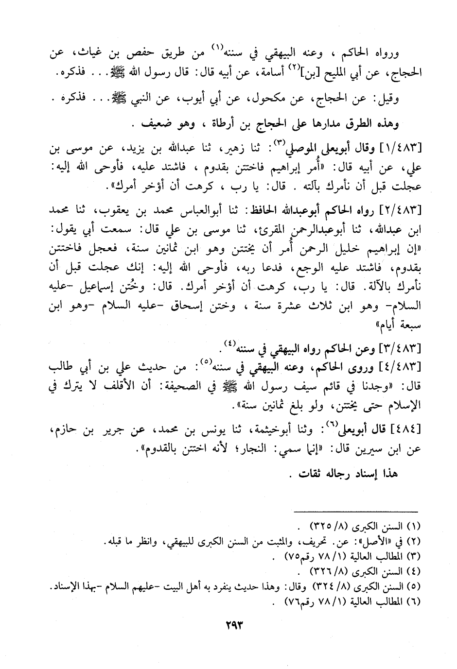 483 / 4 - وَرَوَى الْحَاكِمُ، وَعَنْهُ الْبَيْهَقِيُّ فِي سُنَنِهِ: مِنْ حَدِيثِ عَلِيِّ بْنِ أَبِي طَالِبٍ قَالَ: "وَجَدْنَا فِي قَائِمِ سَيْفِ رَسُولِ اللَّهِ - صَلَّى اللَّهُ عَلَيْهِ وَسَلَّمَ - أَوْ فِي الصَّحِيفَةِ: أَنَّ الْأَقْلَفَ لَا يُتْرَكُ فِي الْإِسْلَامِ حَتَّى يَخْتَتِنَ، وَلَوْ بَلَغَ ثَمَانِينَ سَنَةً".
