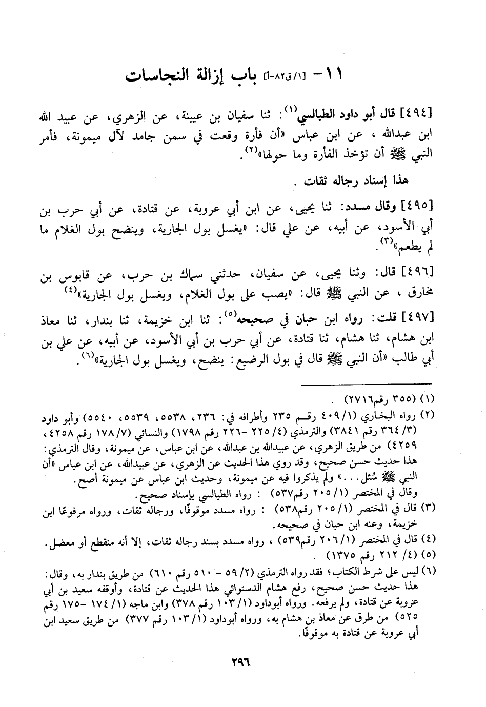 497 - قُلْتُ: رَوَاهُ ابْنُ حِبَّانَ فِي صَحِيحِهِ: ثَنَا ابْنُ خُزَيْمَةَ، ثَنَا بندار، ثنا معاذ ابن هِشَامٍ، ثَنَا هِشَامٌ، ثَنَا قَتَادَةُ، عَنْ أَبِي حَرْبِ بْنِ أَبِي الْأَسْوَدِ، عَنْ أَبِيهِ، عَنْ عَلِيِّ بْنِ أَبِي طَالِبٍ "أَنّ النَّبِيَّ - صَلَّى اللَّهُ عَلَيْهِ وَسَلَّمَ - قَالَ فِي بَوْلِ الرَّضِيعِ: يُنْضَحُ، وَيُغْسَلُ بَوْلُ الْجَارِيَةِ".