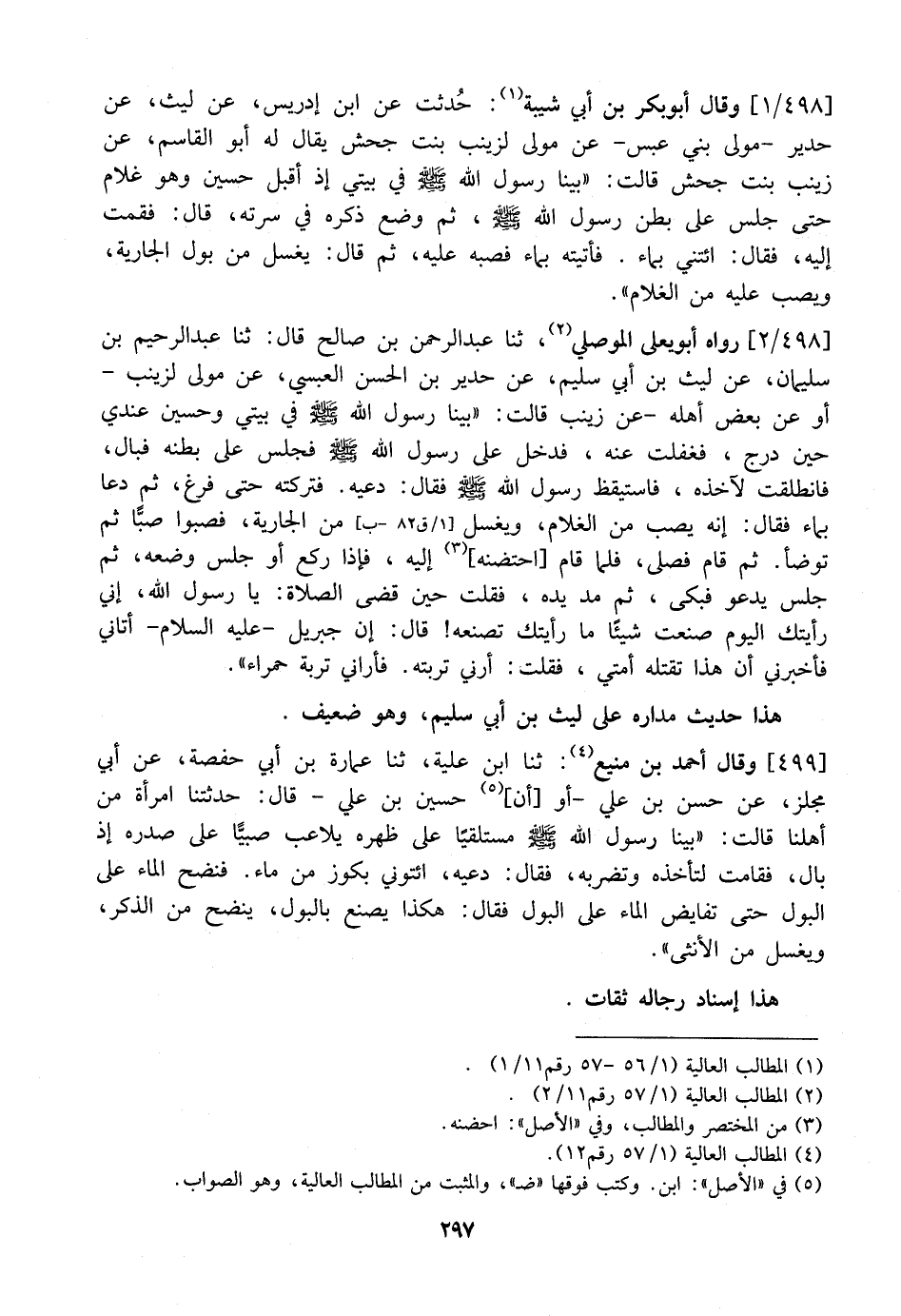 498 / 1 - وَقَالَ أَبُو بَكْرِ بْنُ أَبِي شَيْبَةَ: حُدثت عَنِ ابْنِ إِدْرِيسَ، عَنْ لَيْثٍ، عَنْ حُدَيْرٍ- مولى بني عَبْسٍ- عَنْ مَوْلًى لِزَيْنَبَ بِنْتِ جَحْشٍ يُقَالُ لَهُ أَبُو الْقَاسِمِ، عَنْ زَيْنَبَ بِنْتِ جَحْشٍ قَالَتْ: "بَيْنَا رَسُولُ اللَّهِ - صَلَّى اللَّهُ عَلَيْهِ وَسَلَّمَ - فِي بَيْتِي إِذْ أَقْبَلَ حُسَيْنٌ وَهُوَ غُلَامٌ حَتَّى جَلَسَ عَلَى بَطْنِ رَسُولِ اللَّهِ - صَلَّى اللَّهُ عَلَيْهِ وَسَلَّمَ -، ثُمَّ وَضَعَ ذَكَرَهُ في سرته، قال: فقمت إليه، فقال: ائتني بِمَاءٍ. فَأَتَيْتُهُ بِمَاءٍ فَصَبَّهُ عَلَيْهِ، ثُمَّ قَالَ: يُغْسَلُ مِنْ بَوْلِ الْجَارِيَةِ، وَيُصَبُّ عَلَيْهِ مِنَ الْغُلَامِ ".