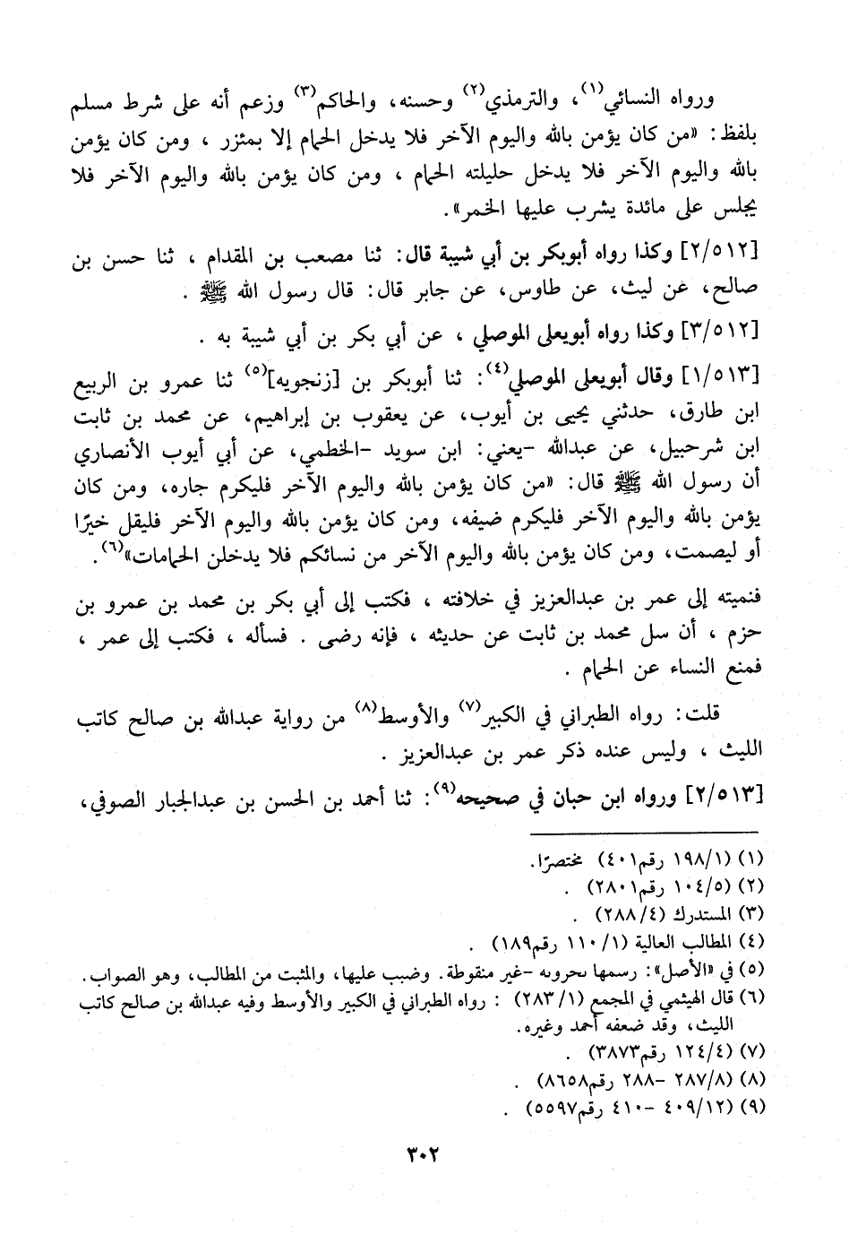 513 / 1 - وقال أبو يعلى ا! لوصلي: ثنا أبو بكر بن زنجويه ثَنَا عَمْرُو بْنُ الرَّبِيعِ بْنِ طَارِقٍ، حَدَّثَنِي يَحْيَى بْنُ أَيُّوبَ، عَنْ يَعْقُوبَ بْنِ إِبْرَاهِيمَ، عن محمد بن ثابت ابن شرحبيل، عن عبد الله- يعني: ابن سويد- الْخَطَمِيَّ، عَنْ أَبِي أَيُّوبَ الْأَنْصَارِيِّ أَنَّ رَسُولَ اللَّهِ - صَلَّى اللَّهُ عَلَيْهِ وَسَلَّمَ - قَالَ: "مَنْ كَانَ يُؤْمِنُ بِاللَّهِ وَالْيَوْمِ الْآخِرِ فَلْيُكْرِمْ جَارَهُ، وَمَنْ كَانَ يُؤْمِنُ بِاللَّهِ وَالْيَوْمِ الْآخِرِ فَلْيُكْرِمْ ضَيْفَهُ، وَمَنْ كَانَ يُؤْمِنُ بِاللَّهِ وَالْيَوْمِ الْآخِرِ فَلْيَقُلْ خَيْرًا أَوْ لِيَصْمُتْ، وَمَنْ كَانَ يُؤْمِنُ بالله واليوم الآخر من نسائكم فلا يدخلن الحمامات ".