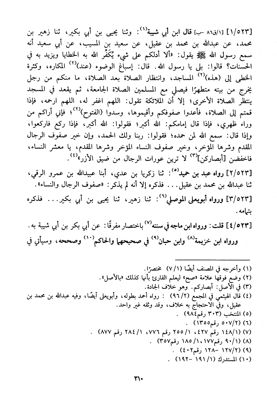 523 / 1 - قَالَ ابْنُ أَبِي شَيْبَةَ: وَثَنَا يَحْيَى بْنُ أَبِي بُكَيْرٍ، ثَنَا زُهَيْرُ بْنُ مُحَمَّدٍ، عَنْ عَبْدِ اللَّهِ بْنِ مُحَمَّدِ بْنِ عُقَيْلٍ، عَنْ سَعِيدِ بْنِ الْمُسَيِّبِ، عَنْ أَبِي سَعِيدٍ أَنَّهُ سَمِعَ رَسُولَ اللَّهِ - صَلَّى اللَّهُ عَلَيْهِ وَسَلَّمَ - يَقُولُ: "أَلَا أَدُلُّكُمْ عَلَى شَيْءٍ يُكَفِّر اللَّهُ به الخطايا ويزيد به الْحَسَنَاتِ؟ قَالُوا: بَلَى يَا رَسُولَ اللَّهِ. قَالَ: إسباغ الوضوء (عند) المكاره، وكثرة الخطى إِلَى (هَذِهِ) الْمَسَاجِدِ، وَانْتِظَارُ الصَّلَاةِ بَعْدَ الصَّلَاةِ، مَا مِنْكُمْ مِنْ رَجُلٍ يَخْرُجُ مِنْ بَيْتِهِ مُتَطَهِّرًا فَيُصَلِّي مَعَ الْمُسْلِمِينَ الصَّلَاةَ الْجَامِعَةَ، ثُمَّ يَقْعُدُ فِي الْمَسْجِدَ يَنْتَظِرُ الصَّلَاةَ الْأُخْرَى" إِلَّا أَنَّ الْمَلَائِكَةَ تَقُولُ: اللَّهُمَّ اغْفِرْ لَهُ، اللَّهُمَّ ارْحَمْهُ، فإذا قمتم إلى الصلاة، فأعدوا صُفُوفَكُمْ وَأَقِيمُوهَا، وَسُدُّوا (الْفُتُوحَ) ؟ فَإِنِّي أَرَاكُمْ مِنْ وَرَاءِ ظَهْرِي، فَإِذَا قَالَ إِمَامُكُمْ: اللَّهُ أَكْبَرُ؟ فَقُولُوا: اللَّهُ أَكْبَرُ، فَإِذَا رَكَعَ فَارْكَعُوا، وَإِذَا قَالَ: سَمِعَ اللَّهُ لِمَنْ حَمِدَهُ؟ فَقُولُوا: رَبَّنَا ولك الْحَمْدُ، وَإِنَّ خَيْرَ صُفُوفِ الرِّجَالِ الْمُقَدَّمُ وَشَرَّهَا الْمُؤَخَّرُ، وَخَيْرُ صُفُوفِ النِّسَاءِ الْمُؤَخَّرُ وَشَرُّهَا الْمُقَدَّمُ، يَا مَعْشَرَ النساء، فاخفضن أَبْصَارَكُنَّ لَا تَرَيْنَ عَوْرَاتِ الرِّجَالِ مِنْ ضِيقِ الْأُزُرِ".