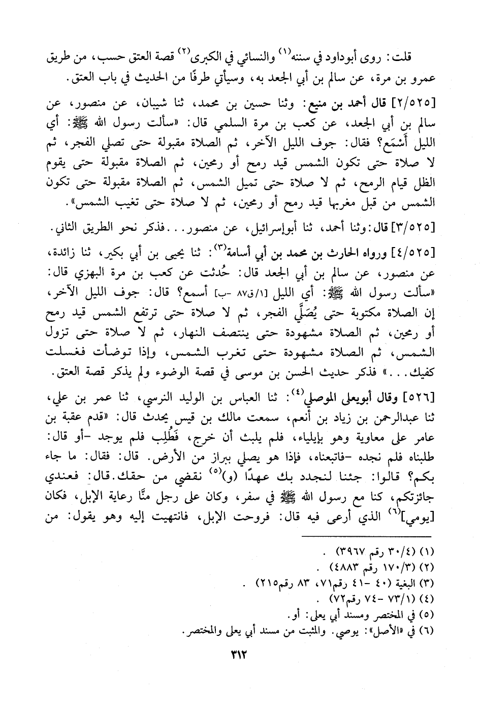 525 / 4 - وَرَوَاهُ الْحَارِثُ بْنُ مُحَمَّدِ بْنِ أَبِي أُسَامَةَ: ثَنَا يَحْيَى بْنُ أَبِي بُكَيْرٍ، ثَنَا زَائِدَةُ، عَنْ مَنْصُورٍ، عَنْ سَالِمِ بْنِ أَبِي الْجَعْدِ قَالَ: حُدثت عَنْ كَعْبِ بْنِ مُرَّةَ الْبَهْزِيِّ قَالَ: "سَأَلْتُ رَسُولَ اللَّهِ - صَلَّى اللَّهُ عَلَيْهِ وَسَلَّمَ -: أَيُّ اللَّيْلِ أَسْمَعُ؟ قَالَ: جَوْفُ اللَّيْلِ الْآخِرِ، إن الصلاة مكتوبة حتى يُصَلَّي الفجر، ثم لا صلاة حتى ترتفع الشَّمْسُ قَيْدَ رُمْحٍ أَوْ رُمْحَيْنِ، ثُمَّ الصَّلَاةُ مشهودة حتى ينتصف النهار، ثُمَّ لَا صَلَاةَ حَتَّى تَزُولَ الشَّمْسُ، ثُمَّ الصلاة مشهودة حتى تغرب الشمس، وإذا تَوَضَّأْتَ فَغَسَلْتَ كَفَّيْكَ ... " فَذَكَرَ حَدِيثَ الْحَسَنِ بْنِ مُوسَى فِي قِصَّةِ الْوُضُوءِ وَلَمْ يَذْكُرْ قِصَّةَ الْعِتْقِ.