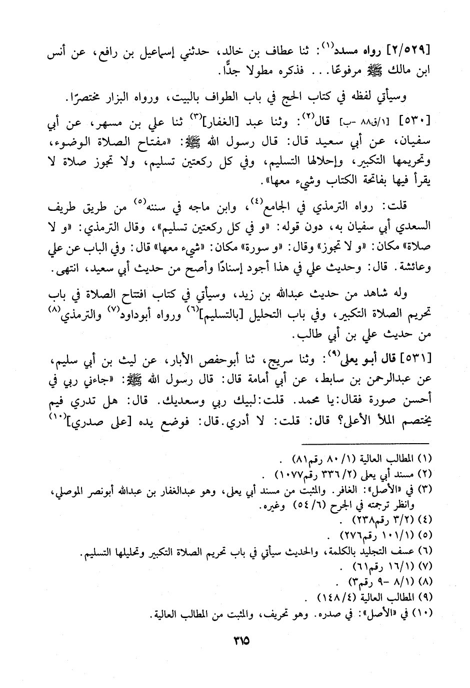 531 - قَالَ أَبُو يَعْلَى: وثنا سُرَيْجٌ، ثَنَا أَبُو حَفْصٍ الْأَبَّارُ، عَنْ لَيْثِ بْنِ أَبِي سُلَيْمٍ، عَنْ عَبْدِ الرَّحْمَنِ بْنِ سَابِطٍ، عَنْ أَبِي أُمَامَةَ قَالَ: قَالَ رَسُولُ اللَّهِ - صَلَّى اللَّهُ عَلَيْهِ وَسَلَّمَ -: "جَاءَنِي رَبِّي فِي أَحْسَنِ صُورَةٍ فَقَالَ: يَا مُحَمَّدُ. قُلْتُ: لَبَّيْكَ رَبِّي وَسَعْدَيْكَ. قَالَ: هَلْ تَدْرِي فِيمَ يَخْتَصِمُ الْمَلَأُ الْأَعْلَى؟ قَالَ: قُلْتُ: لَا أَدْرِي. قال: فوضع يده على صدري،