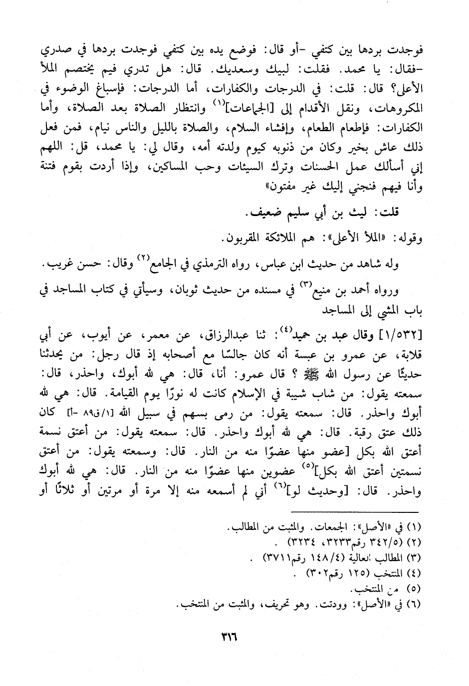 فَوَجَدْتُ بَرْدَهَا بَيْنَ كَتِفِي- أَوْ قَالَ: فَوَضَعَ يَدَهُ بَيْنَ كَتِفِي فَوَجَدْتُ بَرْدَهَا فِي صَدْرِي - فَقَالَ: يَا مُحَمَّدُ. فَقُلْتُ: لَبَّيْكَ وَسَعْدَيْكَ. قَالَ: هَلْ تَدْرِي فِيمَ يَخْتَصِمُ الْمَلَأُ الْأَعْلَى؟ قَالَ: قُلْتُ: فِي الدَّرَجَاتِ وَالْكَفَّارَاتِ، أَمَّا الدَّرَجَاتُ: فَإِسْبَاغُ الوضوء في المكروهات، ونقل الأقدام إلى الجماعات وَانْتِظَارُ الصَّلَاةِ بَعْدَ الصَّلَاةِ، وَأَمَّا الْكَفَّارَاتُ: فَإِطْعَامُ الطَّعَامِ، وَإِفْشَاءُ السَّلَامِ، وَالصَّلَاةُ بِاللَّيْلِ وَالنَّاسُ نِيَامٌ، فَمَنْ فَعَلَ ذَلِكَ عَاشَ بِخَيْرٍ وَكَانَ مِنْ ذُنُوبِهِ كَيَوْمِ وَلَدَتْهُ أُمُّهُ، وَقَالَ لِي: يَا مُحَمَّدُ، قُلْ: اللَّهُمَّ إِنِّي أَسْأَلُكَ عَمَلَ الْحَسَنَاتِ وَتَرْكَ السَّيِّئَاتِ وَحُبَّ الْمَسَاكِينِ، وَإِذَا أَرَدْتَ بِقَوْمٍ فِتْنَةً وَأَنَا فِيهِمْ فَنَجِّنِي إِلَيْكَ غَيْرَ مَفْتُونٍ "