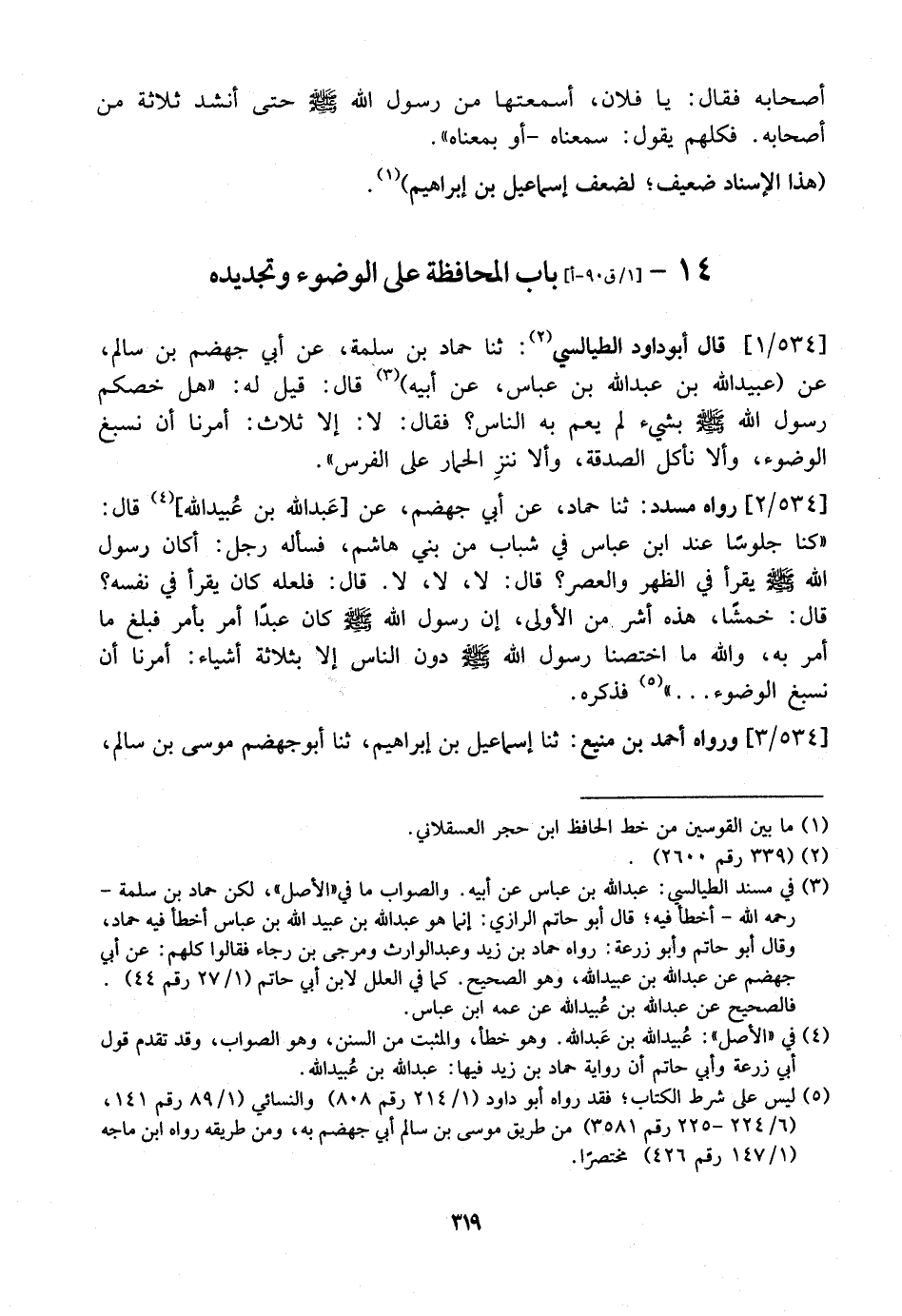 534 / 1 - قَالَ أَبُو دَاوُدَ الطَّيَالِسِيُّ: ثَنَا حَمَّادُ بْنُ سَلَمَةَ، عَنْ أَبِي جَهْضَمِ بْنِ سَالِمٍ، عَنْ (عُبَيْدِ اللَّهِ بْنِ عَبْدِ اللَّهِ بْنِ عَبَّاسٍ، عَنْ أَبِيهِ) قَالَ: قَيِلَ لَهُ: "هَلْ خَصَّكُمْ رَسُولُ اللَّهِ - صَلَّى اللَّهُ عَلَيْهِ وَسَلَّمَ - بِشَيْءٍ لَمْ يَعُمَّ بِهِ النَّاسَ؟ فقال: لا: إلا ثلاث: أمرنا أن نسبغ الوضوء، وألا نأكل الصدقة، وألا ننزِ الْحِمَارَ عَلَى الْفَرَسِ ".