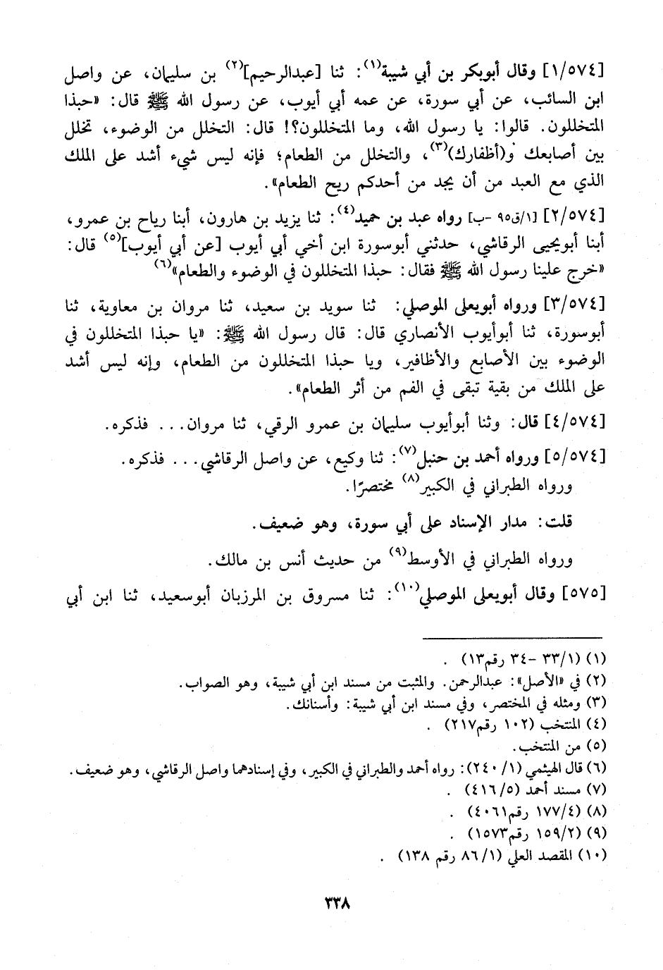 574 / 2 - رَوَاهُ عَبْدُ بْنُ حُمَيْدٍ: ثَنَا يَزِيدُ بْنُ هَارُونَ، أبنا رياح بن عمرو، أبنا أَبُو يَحْيَى الرَّقَاشِيُّ، حَدَّثَنِي أَبُو سَوْرَةَ ابْنُ أخي أبي أَيُّوبَ عَنْ أَبِي أَيُّوبَ قَالَ: "خَرَجَ عَلَيْنَا رَسُولُ اللَّهِ - صَلَّى اللَّهُ عَلَيْهِ وَسَلَّمَ - فقال: حبذا المتخللون في الوضوء والطعام "